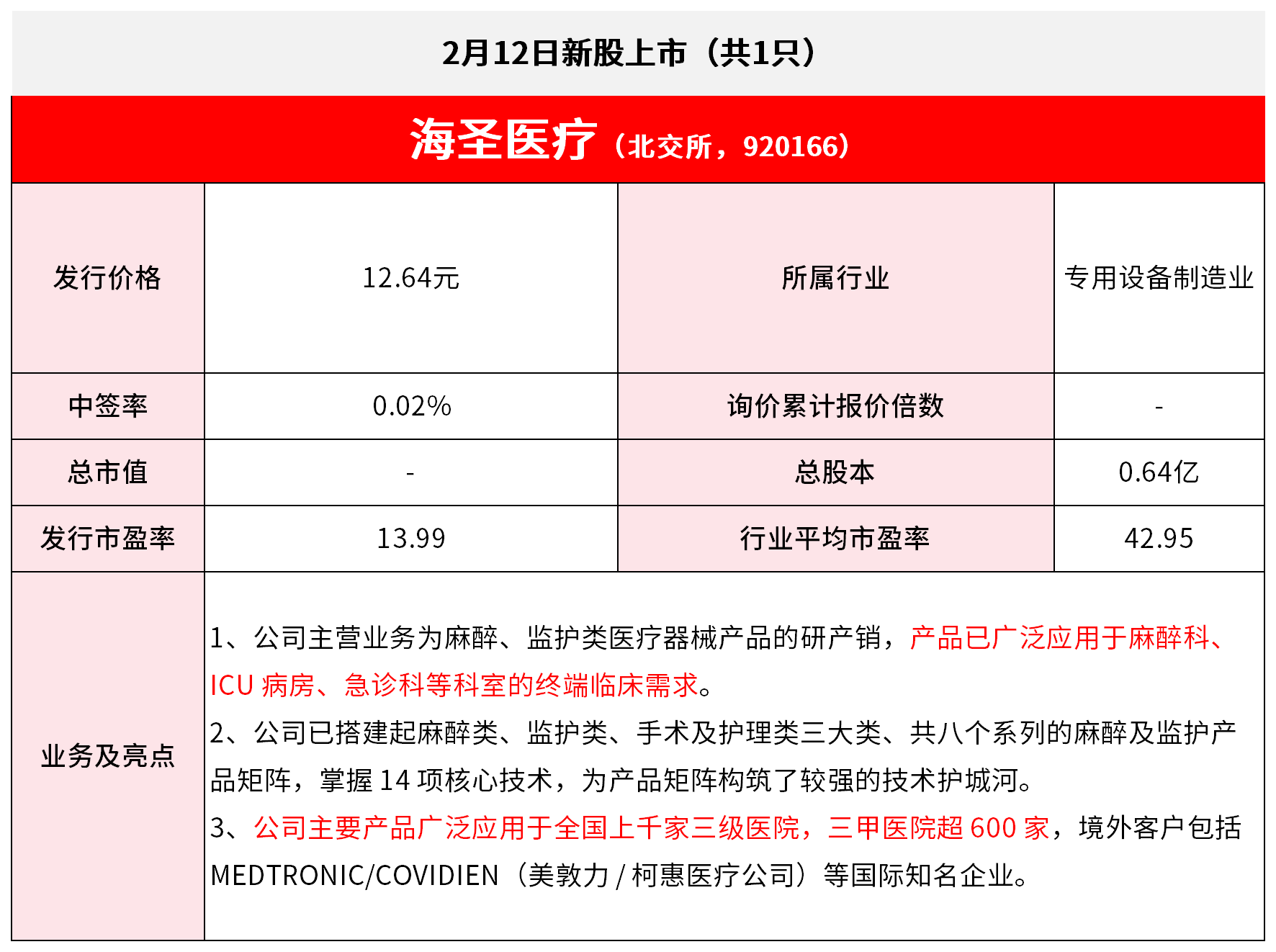 发行基本信息 - 发行价格为12.64元 [2] - 发行市盈率为13.99倍 [2] - 网上申购中签率为0.02% [2] 业务与产品 - 公司主营业务为麻醉、监护类医疗器械产品 [2] - 产品满足ICU病房、急诊科等科室的终端临床需求 [2] - 公司已搭建起麻醉类、监护类、手术及护理类产品矩阵 [2] 技术与市场 - 公司掌握14项核心技术,为产品矩阵构筑了技术基础 [2] - 主要产品广泛应用于全国上千家三级医院 [2] - 公司产品与美敦力/柯惠医疗等国际品牌存在竞争或共存关系 [2]