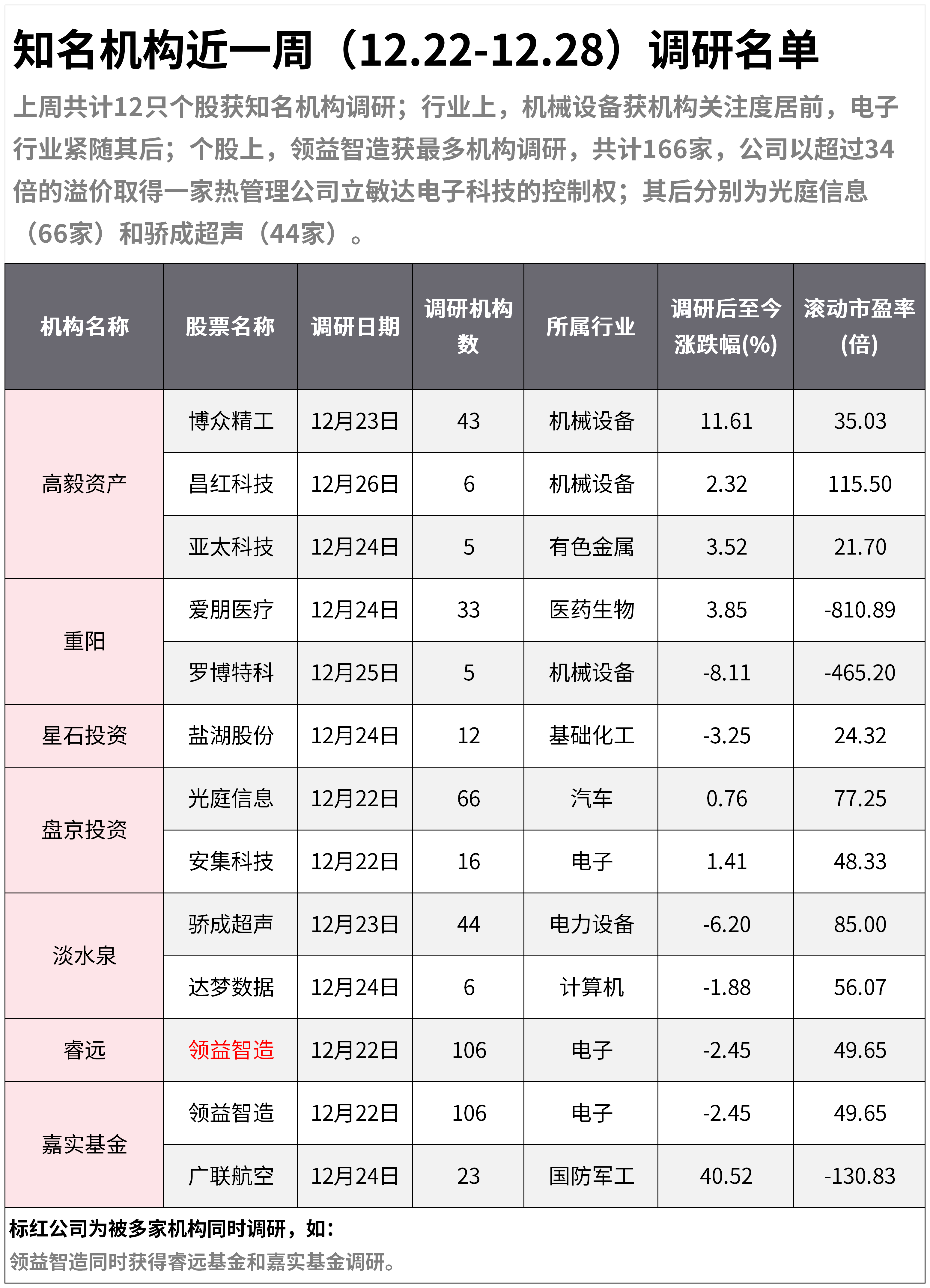 知名机构近一周(12.22-12.28)调研名单:机构扎堆这只超高溢价并购概念股