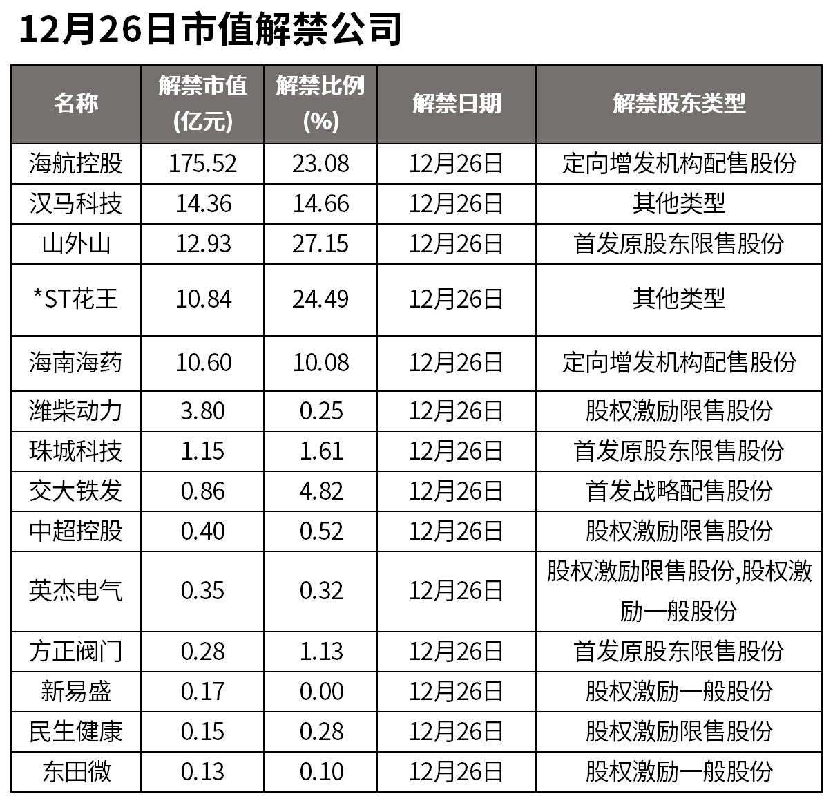 行情回顾 - 市场全天冲高回落,三大指数小幅上涨,沪指录得8连阳 [1] - 商业航天概念延续强势,神剑股份7连板,中国卫星、中国卫通等多股涨停 [1] - 海南自贸区反复活跃,海南矿业、海汽集团等涨停 [1] - 锂电池板块盘中拉升,丰元股份、永兴材料等涨停 [1] - 有色板块集体走强,江西铜业、国城矿业等涨停 [1] - 算力硬件股调整,长光华芯跌超10% [1] - 个股跌多涨少,沪深京三市超3400股飘绿,今日成交2.18万亿 [1] 航天板块 - 航天板块今日继续强势,再升科技、神剑股份、通宇通讯等多股涨停,中国卫星3连板股价逼近历史新高 [3] - 上海市人民政府办公厅印发《关于支持长三角G60科创走廊策源地建设的若干措施》,提出加速航空航天产业发展 [3] - 再升科技15天9板,最新价13.34元,涨跌幅+9.98%,流通市值137.42亿 [4] - 神剑股份7天7板,最新价13.17元,涨跌幅+10.03%,流通市值106.56亿 [4] - 通宇通讯10天5板,最新价42.00元,涨跌幅+10.01%,流通市值140.02亿 [4] - 中邮证券指出,可回收火箭方面,我国“朱雀三号”等已进入关键验证阶段 [4] - 卫星规模化制造方面,国内年产超500颗的智能生产线已现,海南文昌卫星超级工厂设计年产1000颗,预计2025年底竣工 [4] - 海南商业发射场等专用基础设施投用,将系统性提升发射保障能力 [4] - 随着三大驱动力形成共振,我国发射成本有望进入快速下行通道,推动商业航天突破规模化临界点 [4] 锂电池板块 - 锂电池板块今日强势反弹,天际股份、深圳新星、丰元股份等多股涨停 [5] - 据21世纪经济报道,自2026年1月1日起,天齐锂业所有产品现货交易结算价将不再参考现有标准,调整为参考Mysteel的电池级锂盐价格或广期所碳酸锂期货主力合约价格 [5] - 湖南裕能公告,公司拟对部分生产线进行检修,检修时间从2026年1月1日起,预计一个月 [5] - 万润新能公告,自12月28日起,公司将对部分磷酸铁锂产线进行为期一个月的计划性减产检修 [5] - 天际股份8天4板,最新价49.50元,涨跌幅+10.00%,流通市值247.97亿 [6] - 深圳新星4天2板,最新价31.71元,涨跌幅+9.99%,流通市值66.94亿 [6] - 丰元股份最新价18.88元,涨跌幅+10.02%,流通市值52.59亿 [6] - 五矿证券表示,2025年三季度的旺季出现了供需紧平衡的首次测试,2026年产业供需紧平衡有望加剧 [6] - 招商证券认为,对于六氟磷酸锂,前三季度部分头部企业库存不断降低,多家代表性公司库存已耗尽 [7] - 展望26年一季度淡季,即便需求环比下滑20%,六氟公司只需适当补库就能保持满产,本轮涨势有望穿越淡季周期 [7] 海南自贸板块 - 海南自贸今日再度表现,安通控股5连板,海南发展、海汽集团等多股涨停 [8] - 海南自贸港正式启动全岛封关首周,政策红利持续释放 [8] - 海口海关披露,封关首周(12月18日至24日),海南新增外贸备案企业1972家,同比增长2.3倍 [8] - 海南发展6天5板,最新价22.75元,涨跌幅+10.01%,流通市值182.81亿 [9] - 安通控股5天5板,最新价6.55元,涨跌幅+10.08%,流通市值252.98亿 [9] - 海汽集团6天4板,最新价30.38元,涨跌幅+9.99%,流通市值96.00亿 [9] - 华创证券认为,海南封关将作为核心驱动力,在未来持续释放消费潜力,为相关的酒店、免税及旅游产业链公司带来明确的增长机遇 [9] 其他活跃板块 - 除上述热点外,光伏、机器人、有色金属等表现活跃 [10] - 光伏方面,市场监管总局开展规范光伏行业价格竞争秩序合规指导,四家头部硅片企业联合大幅上调报价 [13] - 机器人方面,行业独角兽迎来上市潮 [13] - 有色金属方面,江西铜业涨停 [1][14] - 大消费方面,中央财办称扩大内需是明年排在首位的重点任务 [13] - 国产芯片方面,摩尔线程等陆续上市,长鑫存储此前完成IPO辅导 [14] - 福建自贸/海西概念方面,福建平潭全力冲刺新一轮封关运作 [14] - 光通信板块跌幅居前,行业称光纤散纤价格走高 [10][14] - 无人驾驶方面,L3牌照正式发放 [14] 历史新高公司 - 2025年12月26日,多只股票创历史新高,涵盖航天、有色金属、锂电池等多个板块 [15][16] - 北矿检测(有色金属)涨幅16.44% [15] - 西测测试(航天)涨幅10.97% [15] - 通宇通讯(航天)涨幅10.01% [15] - 中国卫通(航天)涨幅9.98% [15] - 洛阳钼业(有色金属)涨幅5.61% [15] - 紫金矿业(有色金属)涨幅4.68% [16]