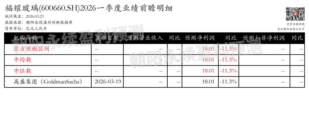 福耀玻璃2025年业绩与2026年一季度展望 - 2025年全年业绩表现强劲,营业收入达457.87亿元,同比增长16.65%,归母净利润达93.12亿元,同比增长24.20% [4][9] - 2025年第四季度业绩持续增长,营业收入和归母净利润分别同比增长14.15%和11.35% [3][8] - 2026年第一季度业绩预期面临压力,根据朝阳永续数据,预测净利润为18.01亿元,同比变动-11.3% [1][6] 盈利能力与财务表现 - 2025年盈利能力提升,毛利率和净利率分别提升1.04和1.23个百分点 [4][9] - 2025年现金流充沛,全年经营活动产生的现金流量净额达120.55亿元,同比增长40.8% [4][9] - 2025年分红比例高,拟派发现金股利54.80亿元,分红比例达58.85% [4][9] 业务驱动因素与增长逻辑 - 全球市场份额持续增长,受益于美国扩产项目、福清出口基地和合肥基地等产能释放 [3][8][9] - 汽车玻璃平均单价显著提升,2025年单价提升8.07%-8.08%,主要受高附加值产品渗透率提升推动 [3][4][8][9] - 产品结构升级,汽车智能化发展推动HUD前挡、全景天幕等高附加值产品渗透率提升,带动单车配套价值量增长 [4][9] 资本开支与海外业务 - 2025年资本性支出达61.64亿元,主要用于固定资产、无形资产和其他长期资产 [4][9] - 境外子公司福耀玻璃美国有限公司表现良好,2025年营业收入折人民币79.17亿元,净利润折人民币8.84亿元,净利率为11.17% [4][9] 卖方机构观点与预测 - 东吴证券观点:认为公司作为全球汽车玻璃行业龙头,份额提升和单车ASP增长推动持续发展 [3][8] - 招商证券观点:强调公司2025年营业收入和净利润显著增长,现金流充沛且分红比例高 [4][9] - 高盛集团预测:截至2026年3月19日,对2026年第一季度的净利润预测为18.01亿元,同比变动-11.3% [2][7]