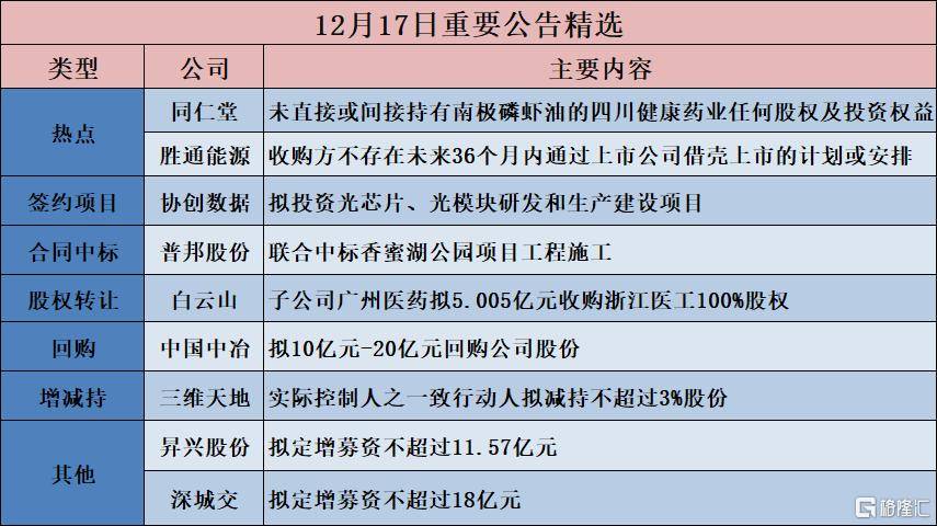 普路通(002769.SZ):拟购买乐其开曼100%股份及杭州乐麦8.26%股权 白云山(600332.SH):子公司广州医药拟5.005亿元收 购浙江医工100%股权 航天智装(300455.SZ):神舟投资拟受让杭州轩宇100%股权 【回购 】 奕瑞科技(688301.SH):拟斥资1亿元-2亿元回购股份 盐津铺子(002847.SZ):拟回购260万股-300万股 华凯易佰(300592.SZ):拟回购1500万元-3000万元公司股份 中国中冶 (601618.SH):拟10亿元-20亿元回购公司股份 | | | 12月17日重要公告精选 | | --- | --- | --- | | 类型 | 公司 | 主要内容 | | 热点 | 同仁堂 | 未直接或间接持有南极磷虾油的四川健康药业任何股权及投资权益 | | | 胜通能源 | 收购方不存在未来36个月内通过上市公司借壳上市的计划或安排 | | 签约项目 | 协创数据 | 拟投资光芯片、光模块研发和生产建设项目 | | 合同中标 | 普邦股份 | 联合中标香蜜湖公园项目工程施工 | | 股权转让 | 白云山 | 子公司广州医药担5.005亿元收购浙江 ...