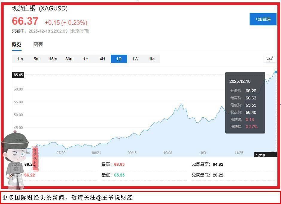 王爷说财经讯:2025年12月18日,全球金融市场迎来历史性时刻——白银市值正式超越谷歌,跻身全球第四大资产!这波席卷全球的白银热潮,已经悄悄影 响到咱们国内中年朋友的理财账户、存款收益甚至养老金规划。 咱们手里的定期存款、股票基金要不要调整?已经入手白银相关产品的朋友该止盈还是持有?没布局的现在进场还来得及吗? 这是四十多年来,白银首次实现市值超越原油,更是贵金属在全球资产排序中少见的跃升。 给大家举个真实案例:杭州的刘先生,咱们中年群体里的普通散户,10月下旬入手了一只白银主题基金,两个月没动,现在浮盈已经接近80%,差不多能赚 出今年的年终奖。 而据LSEG追溯43年的数据显示,白银今年的年度表现,已经创下1982年以来的最佳纪录,远超黄金65%的年内涨幅。 01、白银成为全球第四大资产! 先把核心事件说清楚:截至12月18日收盘,现货白银价格站稳66.5美元/盎司,年内涨幅已突破130%,市值达到3.7万亿美元,成功超越谷歌母公司 Alphabet,仅次于黄金、英伟达和苹果,如下图: | | | | Top Assets by Market Cap | | | | --- | --- | --- | ...