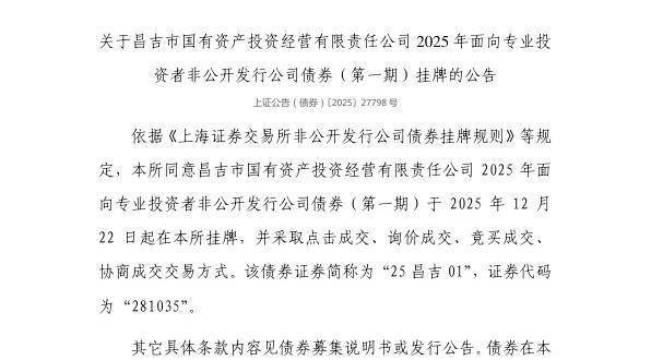 依据《上海证券交易所非公开发行公司债券挂牌规则》等规定,上交所同意昌吉市国有资产投资经营有 限责任公司2025年面向专业投资者非公开发行公司债券(第一期)于2025年12月22日起在上交所挂牌, 并采取点击成交、询价成交、竞买成交、协商成交交易方式。该债券证券简称为"25昌吉01",证券代码 为"281035"。 12月19日,上交所发布关于昌吉市国有资产投资经营有限责任公司2025年面向专业投资者非公开发行公 司债券(第一期)挂牌的公告。 来源:市场资讯 ...