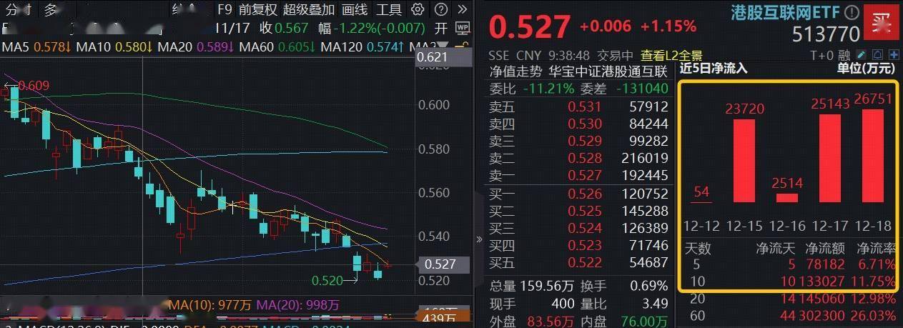 ETF盘中资讯|机构:港股迎来年内最后一次交易窗口!港股AI企稳,百亿港股互联网ETF(513770)涨逾1%,近10日狂揽13亿元