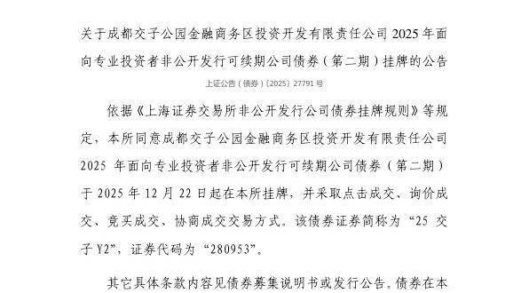 12月19日,上交所发布关于成都交子公园金融商务区投资开发有限责任公司2025年面向专业投资者非公 开发行可续期公司债券(第二期)挂牌的公告。 依据《上海证券交易所非公开发行公司债券挂牌规则》等规定,上交所同意成都交子公园金融商务区投 资开发有限责任公司2025年面向专业投资者非公开发行可续期公司债券(第二期)于2025年12月22日起 在上交所挂牌,并采取点击成交、询价成交、竞买成交、协商成交交易方式。该债券证券简称为"25交 子Y2",证券代码为"280953"。 来源:市场资讯 ...