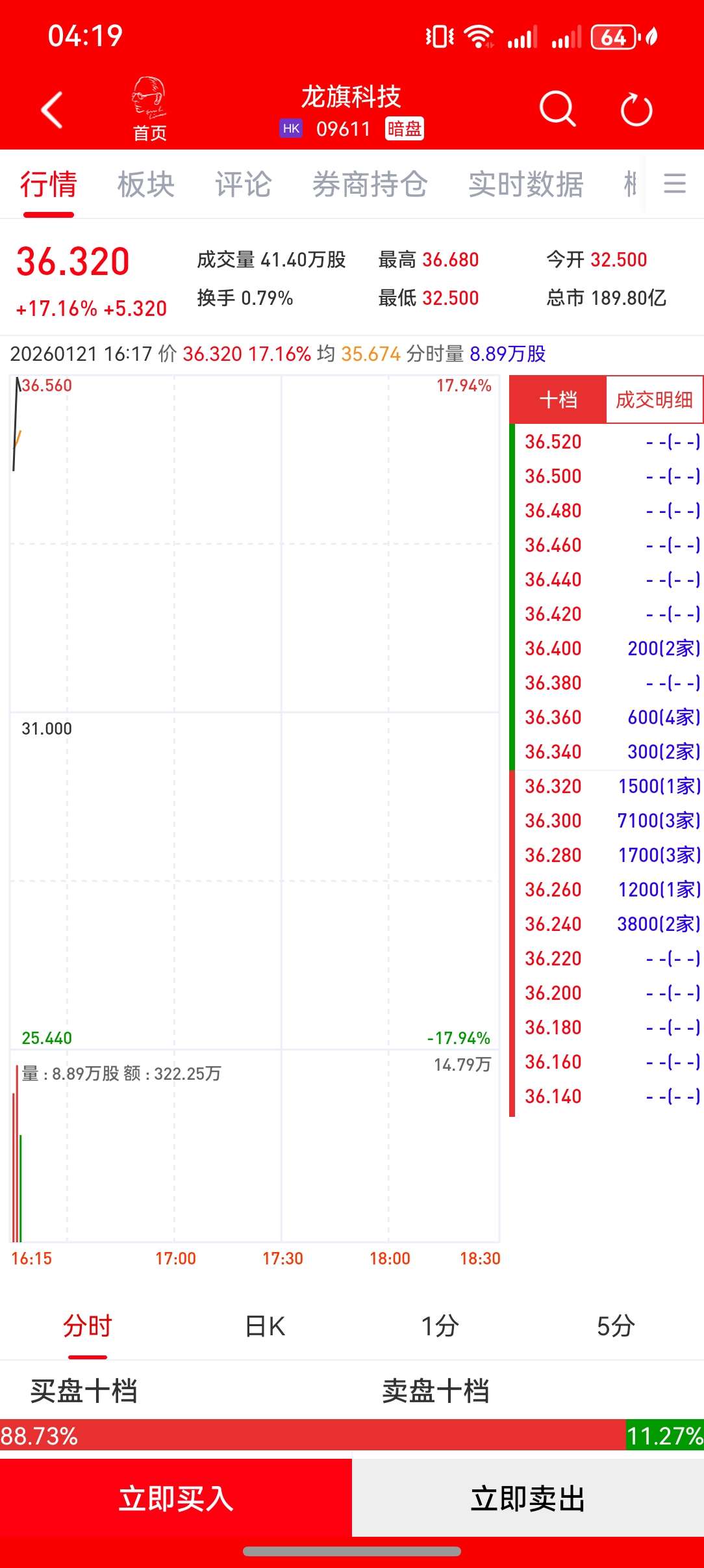 龙旗科技(603341)(09611)将于1月22日(星期四)在香港挂牌。截至发稿,利弗莫尔证券暗盘交易显示报价36.32港元,较招股价31港元上涨17.16%,每手 100股,不计手续费,每手赚532港元。 36.200 - -(- -) = -(- -) 36.180 25.440 -17.94% - -(- -) 36.160 14.79万 |量:8.89万股 额:322.25万 - -(- -) 36.140 17:30 18:30 16:15 17:00 18:00 | 分时 | 日K | 1分 | | 5分 | | --- | --- | --- | --- | --- | | 製品十档 | | 或者十档 | | | | 88.73% | | | | 11.27% | | 立即买入 | | | 立即卖出 | | | 136.560 | 17.94% | | | | --- | --- | --- | --- | | | | 十档 | 成交明细 | | | | 36.520 | - - (- -) | | | | 36.500 | - - (- -) | | | | 36.480 | - -(- - ...