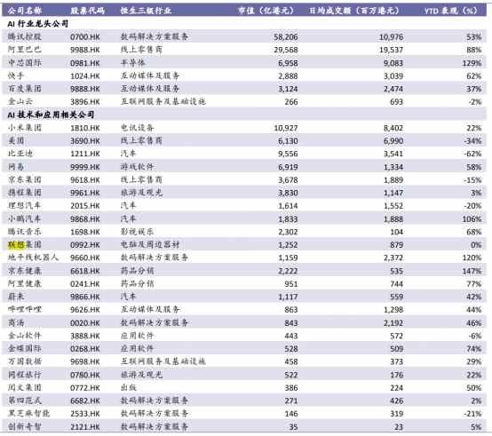 具体到投资标的方面,浦银安盛同时看好AI基础层和应用层公司的观点。基础层的公司不仅能提供短 期的确定性,还能受益于中长期AI技术的提升。在基础层的投资标的中,过去两年大科技企业在AI领 域中投入巨大,在技术储备和赛道布局上都占据了有利的位置,驱动自身盈利增速强劲增长。而在应用 层方面,今年以来我们已经看到越来越多的企业推动AI从被动工具向主动的代理模式(AI Agent)转变。 在这一趋势下,越来越多应用层的企业或将迎来爆发式增长的机会。预计,在AI的高速发展下,更多 细分赛道的优秀公司有望脱颖而出。 基于此,浦银安盛,梳理出24个短期有望受到资金青睐的AI技术和应用相关的港股公司,供投资者参 考: 研报中指出,中美在AI发展上形成了差异化的路径。随着基础设施逐步成熟,AI的投资已进入第二阶 段,市场关注重点转向如何将算力转化成具体应用,但应用落地和变现的路径仍不明朗,谁是最终的赢 家尚未可知。中国人工智能的发展 路径凸显出鲜明的实体经济和国家战略导向。中国大力推进"人工智能+"融合战略,强化其在科技研发 与产业升级中的赋能作用。相较于美国等国家以企业为主导、更侧重于消费端娱乐应用、大模型能力竞 争以及由AI ...