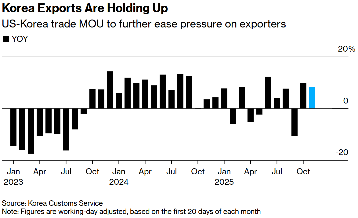 智通财经APP注意到,韩国11月前20日出口额继续保持增长,这主要得益于半导体需求的持续旺盛,尽管美国对汽车征收的高额关税对贸易增长势头造成了 压力。 韩国海关周五公布的数据显示,经工作日差异调整后,11月前20天的出口额同比增长8.2%。这一增幅低于10月份全月14%的增幅。 未调整的出口额也增长了8.2%,而总进口额增长了3.7,实现了24亿美元的贸易顺差。 这些数据为韩国央行在11月27日政策会议前提供了对韩国出口状况的最新解读。一些经济学家预计央行将维持利率不变,因为委员会正在关注美韩协议效果 的滞后影响,同时警惕国内家庭债务和房地产风险。 韩国出口保持稳定 半导体出口增长近27%,在人工智能和数据中心需求的推动下持续复苏。汽车出口也增长了23%,而石化和钢铁产品则因需求疲软和美国更严格的保护主义 措施未能保持增长势头。 美国和韩国经过三个月的谈判,于上月达成了一项具有里程碑意义的关税协议,将美国对韩国商品的关税上限定为15%。然而,目前对汽车征收的25%关税 暂时保持不变。预计一旦与3500亿美元美国投资协议相关的法案于本月晚些时候提交国会,该关税将追溯至11月1日降至15%。 韩国总统李在明此前表 ...