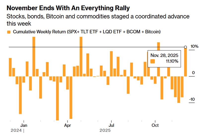 华尔街本周给那些心存疑虑的投资者上了一堂代价高昂的课:在市场狂热中选择"谨慎",往往意味着错失行情。 更关键的是,这次反弹不只是价格层面的上扬,而是结构性、系统性的"重定价"。它代表着资金、流动性、系统性仓位、美联储预期与科技创新周期的多 线共振。 风险偏好全面回归 不同资产之间的联动强度,反映出这并非某一板块的超跌反弹,而是风险偏好的整体回归。 Bitcoin 自 11 月低点反弹超过 7%,加蜜货币作为"散户情绪晴雨表"的意义在于:只有资金真正愿意承担更高波动,它才会率先上涨。 AI 再次成为驱动市场的核心逻辑 这轮反弹最关键的催化剂来自谷歌。 新一代 AI 模型的发布,重新点燃了市场对科技板块的信心,也压住了此前最具杀伤力的疑问:"AI 是不是有泡沫?" 科技股上涨并非单纯估值扩张,而是修复"创新周期"预期。从十月到十一月上旬,市场对 AI 的争论集中在两个问题: 与此同时,一批被大量做空的股.票出现快速回补,从 meme 股到垃圾债,各类高贝塔资产的波动率明显下行。这是市场"重新愿意冒险"的标志。 美债收益率同步回落也推动了资产估值的重新舒展。两年期美债收益率跌至 3.5%,意味着市场在提前定价美联储 ...