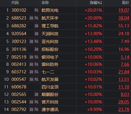 蓝箭航天朱雀三号运载火箭首飞进入冲刺阶段,A股市场的商业航天板块已率先躁动。sh ang周A股商 业航天指数累计上涨6.6%,板块内部更是出现多只涨停个股。 | 代码 | 名称 | 1968098 | 用价 | | --- | --- | --- | --- | | 16 300102 | 陆 乾照光电 | +20.01% | 19.07 | | 2 688523 註陆 航天环宇 | | +20.00% | 38.04 | | 3 688282 | 融 理 导航 | +15.82% | 55.13 | | 4 920564 融 | 天润枝 | +13.90% | 24.18 | | 5 300123 融陆 | 亚米科技 | +13.48% | 7.49 | | 施 6 301136 | 招标股份 | +10.20% | 16.96 | | 7 002519 註陆 | 银河电子 | +10.06% | 5.14 | | 8 002413 註 陆 | 雷科防务 | +10.06% | 7.66 | | 9 603712 註陆 | 七一二 | +10.03% | 21.84 | | 10 000547 盟陆 | 航 ...