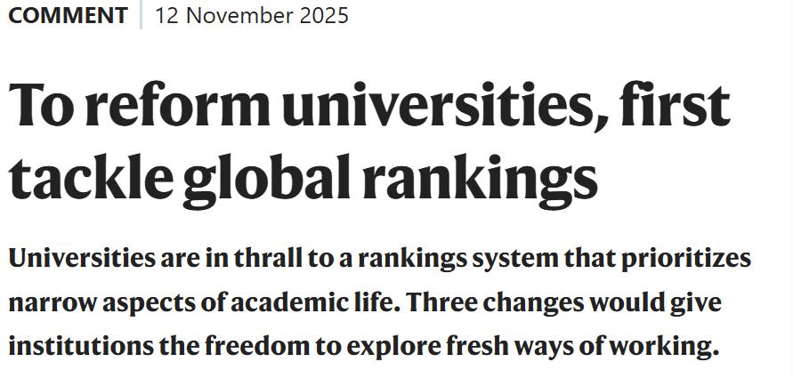 Nature最近的一篇评论揭开了一个难以启齿的真相——大学早已被「全球排名」绑架!数字取代了理想,排位左右了决定。从课堂到政策,一切都在为名 次让路。当教育被算法定义,大学,还能保留自己的灵魂吗? 上周,Nature刊登了一篇评论。 作者Elizabeth Gadd写得很直白——如果想真正改革大学,就得先解构「全球排名」这场游戏。 这篇文章照出了一个熟悉的现实:大学的声誉、经费、招生,乃至老师的工作节奏,早已被榜单牵着走。 看似客观的数字,正在悄悄改写教育的逻辑。 在那之后,我们开始留意校园的日常。原来,这种影响早就无处不在。 校园里的决定:都围着「排名」转 如果你在大学待得够久,大概能察觉到一种难以形容的气氛变化。 不是谁明说的,也不是哪条文件规定的,而是那种——所有人都心照不宣地开始看着同一个方向。 老师在办公室里,常常一边备课,一边刷着论文投稿系统; 行政楼的灯亮得越来越久,他们在核对、整理、上报那几家国际排名机构要的数据; 学校的公众号每隔一段时间,就会发出类似的标题——「本校全球排名再创新高」。 连学生也在这个循环里。选学校、选专业、申请留学,第一反应不是「我想学什么」,而是「它排第几」。 这些小动 ...