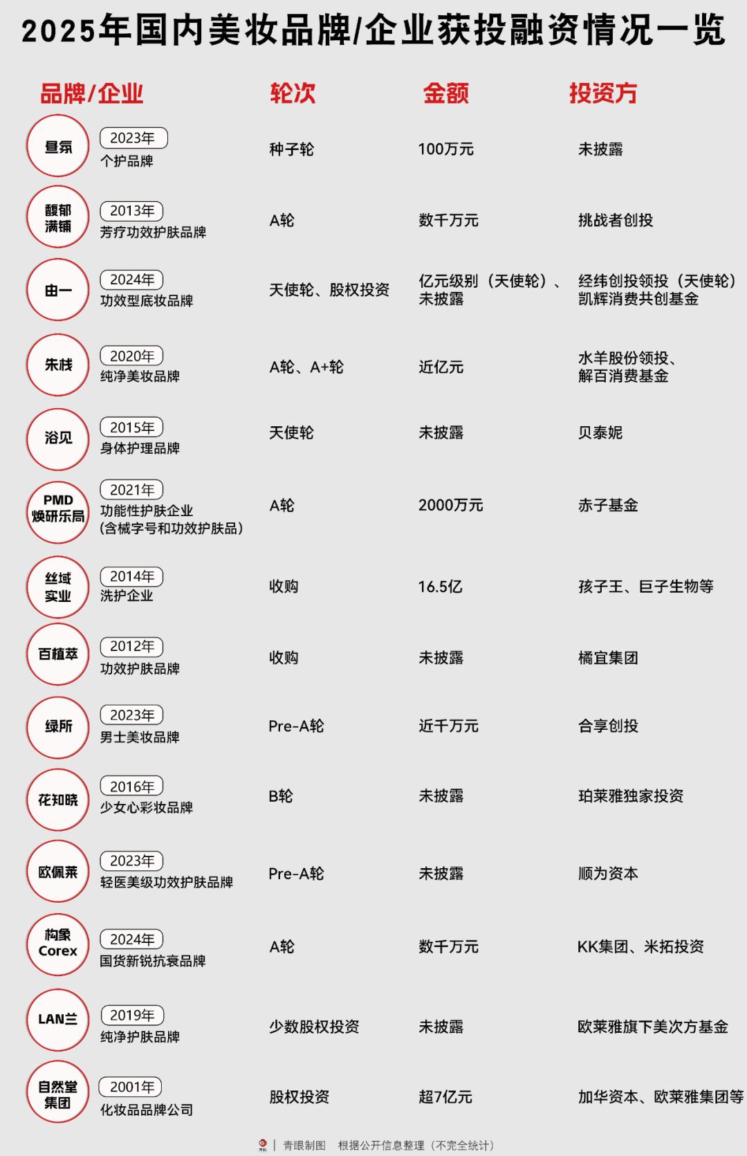 事实上,将时间拉长,在今年1-11月中,获得投融资的美妆企业/品牌也不足2成,大量的热钱均流向了美妆原料上游企业。这背后折射出怎样的行业变 化? 美妆投融资,品牌商受冷 据青眼不完全统计,今年1-11月,国内化妆品相关领域共发生了71起投融资、收并购事件。而从被投资的品牌/企业的类型来看,数量最多的即是原料企 业,共有43起,占比超过60.6%。这充分说明,化妆品上游原料成为了资本市场争相加码的赛道。 美妆品牌不"香"了。 近日,欧莱雅集团对中国纯净护肤品牌LAN兰进行少数股权投资一事,在业内引发了广泛的关注。然而,这也是上月唯一一家已公开的美妆品牌融资案 例,其余获投企业均为上游原料公司,上周刚刚官宣获得A+轮投资的巨微生物,也是一家合成生物原料制造商。 与美妆上游企业备受资本青睐有所不同的是,今年以来,国内美妆品牌商获投的现象则稍显冷清。在上述梳理的71起投融资、收并购事件中,仅有14个美 妆品牌商,占比不足两成。 | 品牌/食物 | 轻次 | | Hose T | | --- | --- | --- | --- | | 2023年 롭溢 个护品牌 | 种子轮 | 100万元 | 未披露 | | 香夏 南 ...