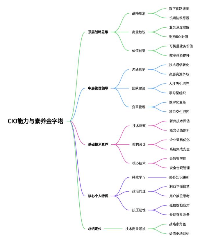 CIO,即首席信息官,来源于Chief Information Officer,最早诞生于20世纪80年代的美国企业,其设立初衷是 bridging the gap between information technology and business strategy,即弥合信息技术与商业战略之间的鸿沟,这一角色不仅要求具备深厚的技术功底,更需拥有战略思维与业务洞察力。 02 CIO所具备的能力及素养 一名合格的CIO必须兼具技术理解力、商业敏感度与组织协同能力,能够将数据资产转化为决策支持工具,推动流程重塑与模式创新,这是我们经常看到 的关于对CIO能力的描述,但老杨认为CIO的能力模型应该是一个金字塔结构,从底层的基础技术到中层的管理与领导力,再到顶层的战略与商业思维, 缺一不可。 首先我们来看一下对CIO基础层的技术能力要求: 1.必须具备技术的前瞻性与洞察力,能够准确判断技术发展趋势,识别哪些技术能真正为业务创造价值,而非盲目追逐热点。这要求CIO持续关注新兴技 术演进路径,理解其在行业场景中的落地可能性,并具备技术选型的决断力。 说起CIO这个岗位,我想大家都不陌生,它是企业数字化转型中的核心角色 ...