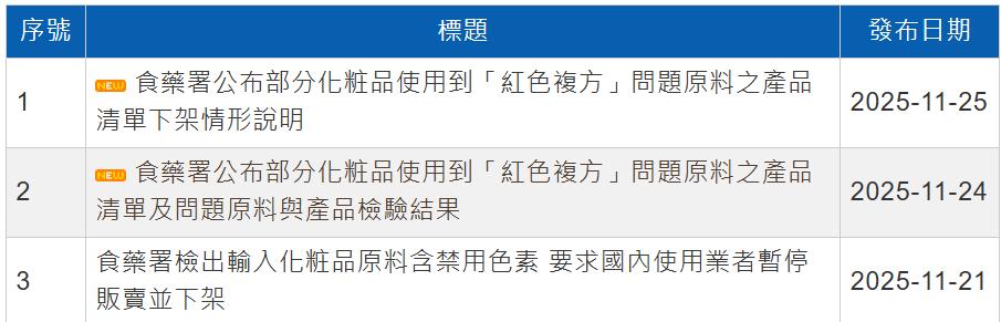 引发行业关注月余的苏丹红Ⅳ事件,近日迎来关键性监管新进展(文末附此事的时间线回顾)。 11月21-25日,台湾食药署发布三份公告,正式通报了"苏丹红Ⅳ"事件中问题原料商、原料及产品的检验结果。 其中"且初"与"绽妍"等产品中检出苏丹红Ⅳ,而涉事进口原料商亦鸿企业则被处以113万元罚款。 | 序號 | 標題 | 發布日期 | | --- | --- | --- | | | → 食藥署公布部分化粧品使用到「紅色複方」問題原料之產品 清單下架情形說明 | 2025-11-25 | | 2 | ■ 食藥署公布部分化粧品使用到「紅色複方」問題原料之產品 清單及問題原料與產品檢驗結果 | 2025-11-24 | | 3 | 食藥署檢出輸入化粧品原料含禁用色素 要求國內使用業者暫停 販賣並下架 | 2025-11-21 | 图源:截自台湾食药署 而在此前,聚美丽也就苏丹红事件背后的真相、争议,与多位业内人士展开深度交流,引发行业高度关注。尤其是该文中点出,此事背后存在被原料商坑 害的嫌疑。 同时,台湾食药署进一步披露,绿藤生物科技股份有限公司(下文称"绿藤生物")在11月12日主动通报,其产品"专心护唇油-莓红版"(3个 ...