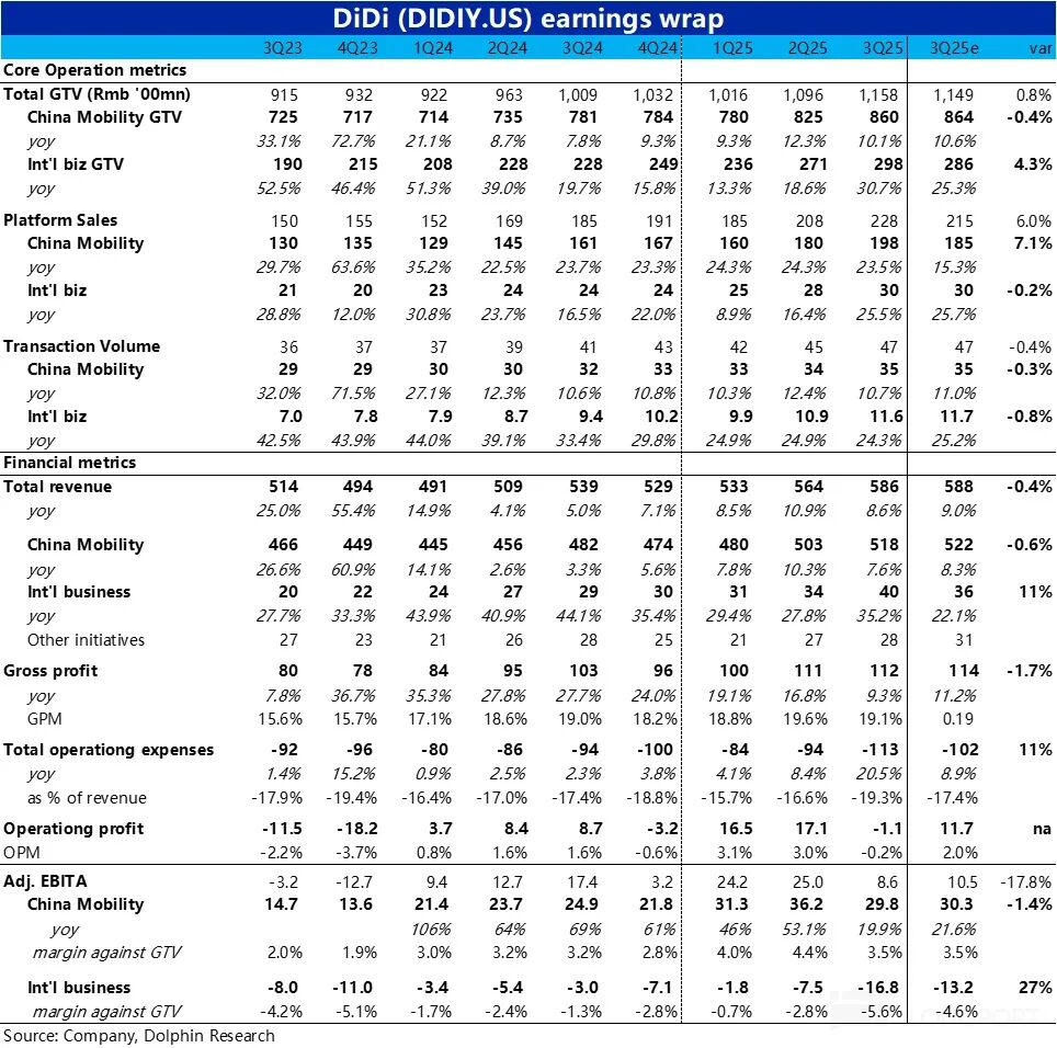 网约车龙头滴滴,于 11 月 26 日晚美股盘前公布了 2025 年 3 季度的业绩。11 月初,滴滴在小范围沟通的指引中,提示市场本季度国内业务的利润率会有 所下滑,而海外则因巴西外卖投入、亏损会大幅扩大。随后滴滴股价回调了近 20%,大体消化了这个坏消息,实际业绩的表现则基本符合新指引。具体 来看: 1、国内出行需求略有走弱,但仍算稳定:滴滴国内业务 GTV 本季度同比增速小幅放缓到 10.1%,和彭博预期大体一致。 分价量驱动因素看,滴滴的国内出行订单量同比增长 10.7%,同样环比略有降速,此外客单价同比跌幅也小幅扩大到-0.5%。换言之,价量因素都略微转 弱的趋势,但幅度不算大,仍算平稳。 根据交通部公布的国内网约车整体订单量,其同比跌幅从 4~5 月 18%~19%,扩大到了 6~8 月的 22%~23%。因此海豚君认为滴滴增长的放缓应当是受行 业整体走弱的拖累,这促使滴滴加大了补贴等投入,来维持国内业务的增长。 2、国内净变现率大体平稳:以国内业务 GTV 约 10% 的增速为基准,本季国内营收同比增长约 8%,平台销售额则同比增长约 23.5%。两者和 GTV 的变 化趋势基本一致,都环比小幅 ...
