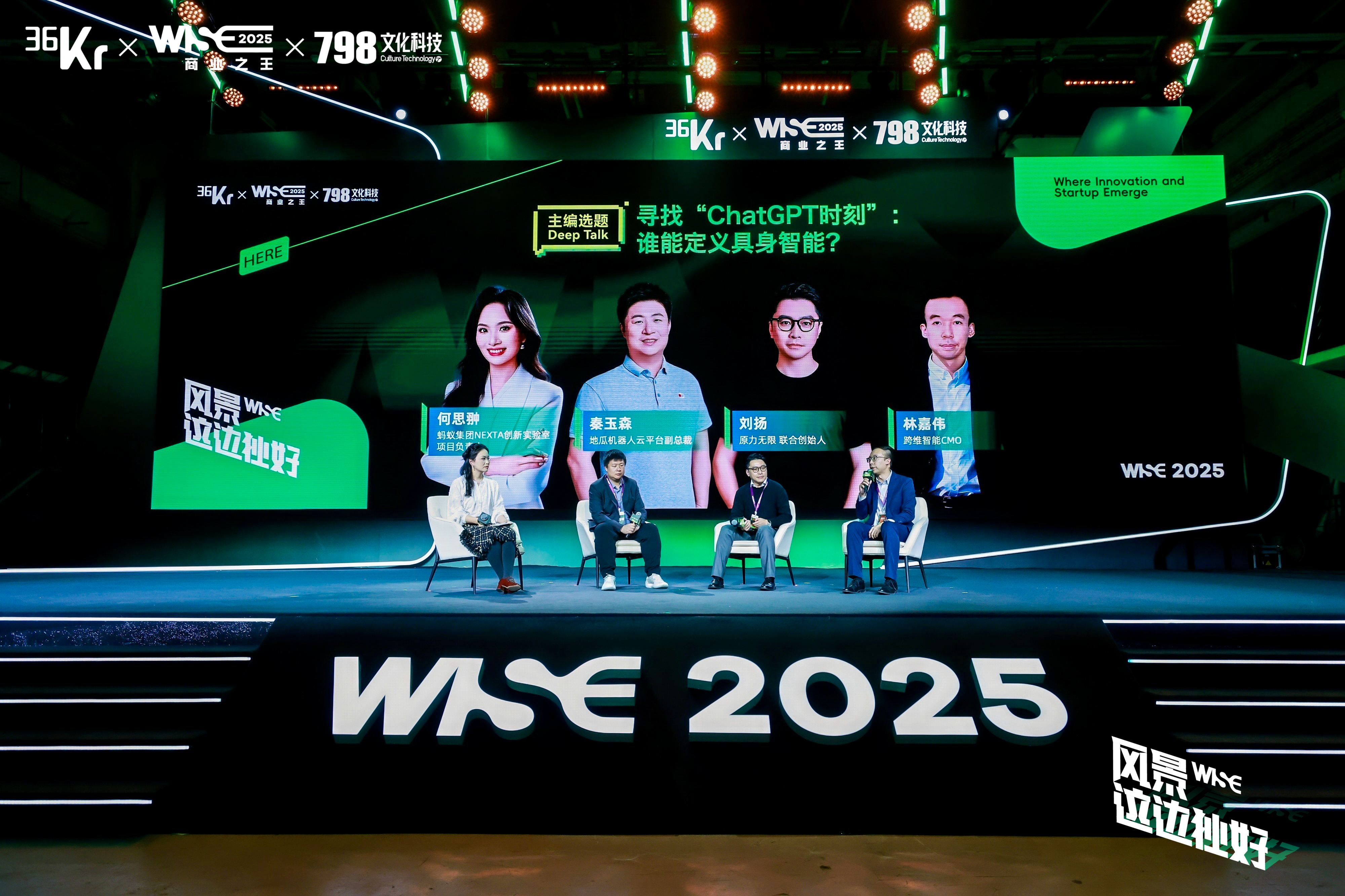 11月27-28日,被誉为"年度科技与商业风向标"的36氪WISE2025商业之王大会,在北京798艺术区传导空间落地。 今年的WISE不再是一场传统意义上的行业峰会,而是一次以"科技爽文短剧"为载体的沉浸式体验。从AI重塑硬件边界,到具身智能叩响真实世界的大门; 从出海浪潮中的品牌全球化,到传统行业装上"赛博义肢"——我们还原的不仅是趋势,更是在捕捉在无数次商业实践中磨炼出的真知。 我们将在接下来的内容中,逐帧拆解这些"爽剧"背后的真实逻辑,一起看尽2025年商业的"风景独好"。 寻找"ChatGPT时刻":谁能定义具身智能?圆桌 以下为圆桌对话内容,经36氪整理编辑: 何思翀丨蚂蚁集团NEXTA创新实验室项目负责人(主持) 秦玉森丨地瓜机器人云平台副总裁 刘扬丨原力无限 联合创始人 林嘉伟丨跨维智能CMO 主持人(嘉伟):亲爱的朋友们,接下来,有请本次Deep Talk环节的主持人:蚂蚁集团NEXTA创新实验室项目负责人 何思翀女士,同时有请地瓜机器人云 平台副总裁 秦玉森先生、原力无限 联合创始人 刘扬先生、跨维智能CMO 林嘉伟先生。让我们掌声有请他们上台为我们带来他们的分享! 何思翀:好,大家下午好 ...
