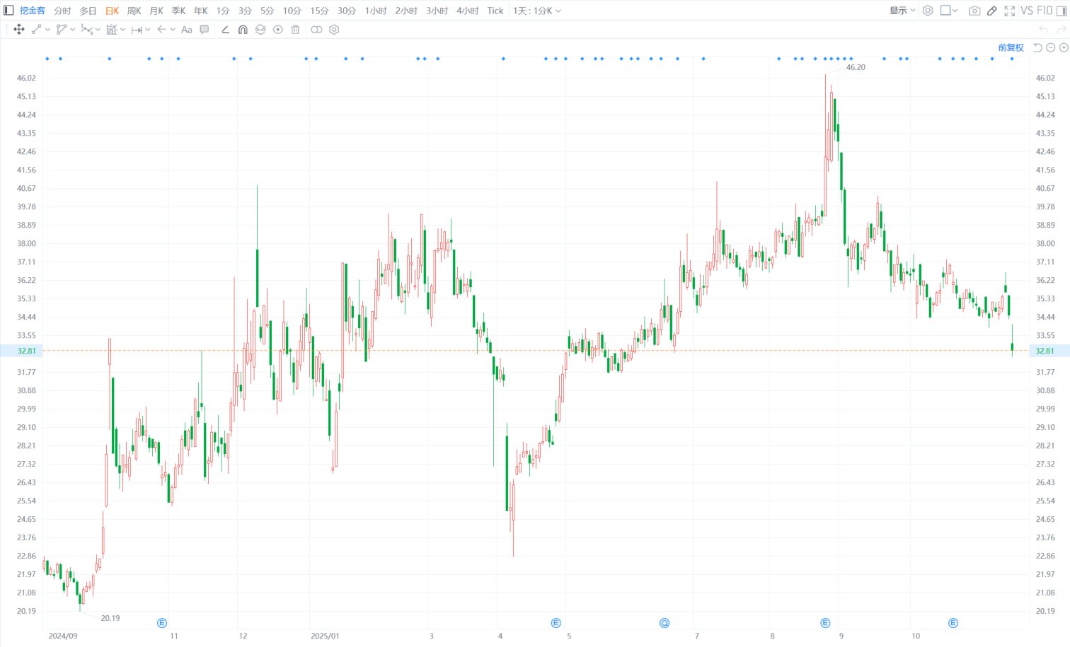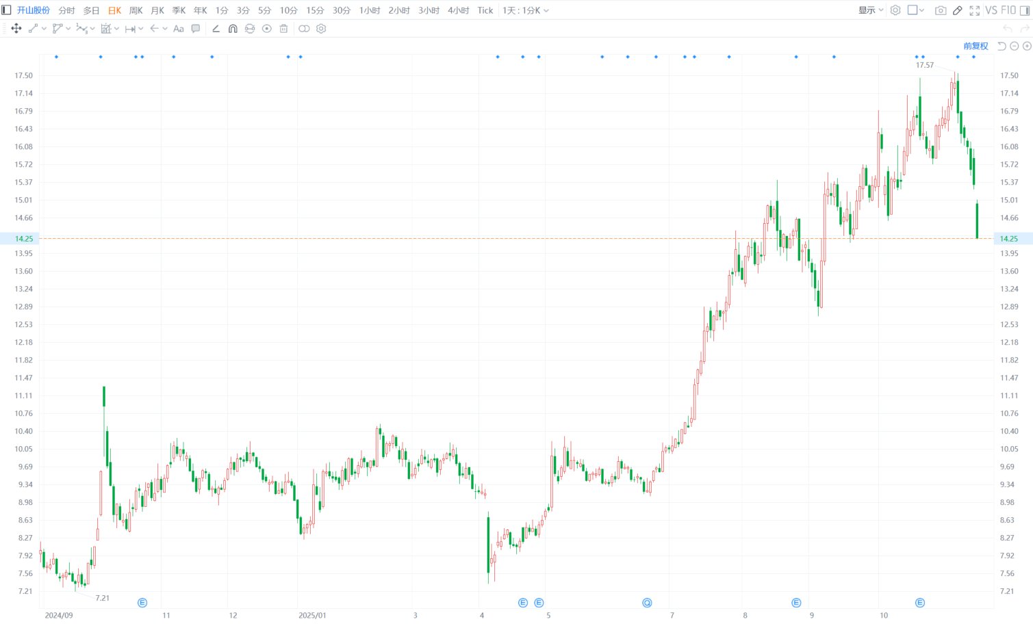 开山股份(300257.8Z)低开低走,一度跌7.11%至14.23元,股价创9月22日以来约2个月新低。开山股份公告称,控股股东开山控股集团股份有限公司计划减持 不超过993.64万股(占公司总股本的1%)的股份,减持方式为集中竞价或大宗交易,减持原因为公司经营需求及支持肯尼亚绿氨化肥项目建设的资金安排,减 持期间为公告披露之日起十五个交易日后的3个月内。(格隆汇) 17.50 17.14 16.79 16.43 16.08 15.72 15.37 15.01 14.66 14.25 13.95 13.60 13.24 12.89 12.53 12.18 11.82 11.47 11.11 10.76 10.40 10.05 9.69 9.34 8.98 8.63 8.27 7.92 7.56 7.21 7.21 ● 国 国 ◎ 2024/09 11 12 2025/01 ■ 开山股份 分时 多日 日K 周K 月K 季K 年K 1分 3分 5分 10分 15分 30分 1小时 2小时 3小时 4小时 Tick 1天:1分K v 中。2 。 【 。 【 、 【 、 、 、 、 、 、 、 、 、 、 、 、 ...