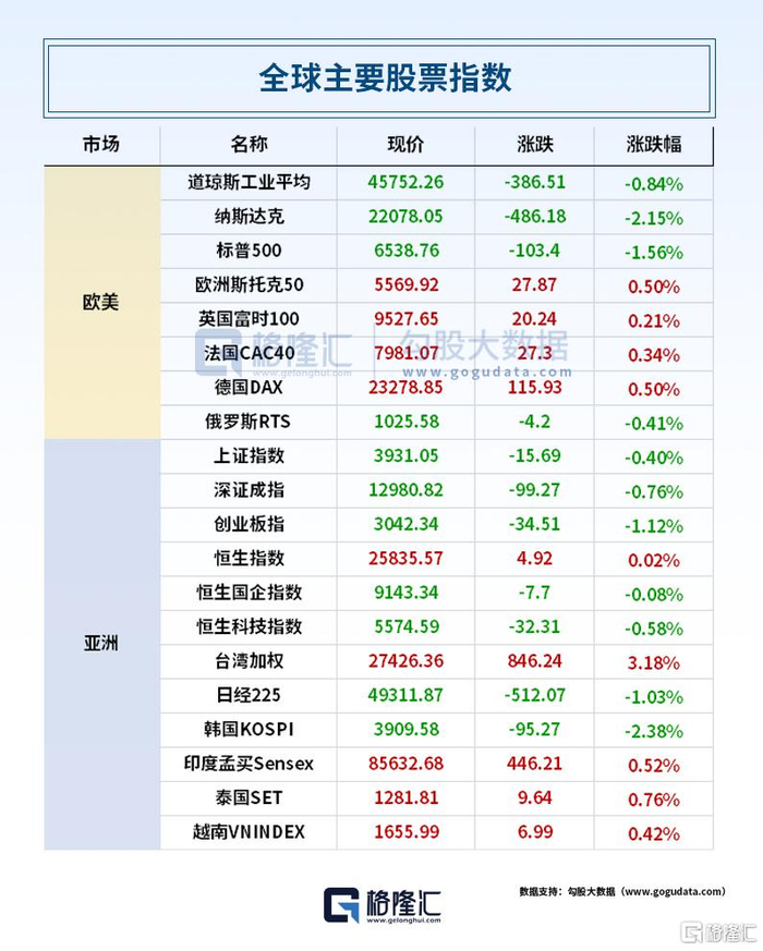 商务部部长会见美驻华大使,聚焦中美经贸磋商成果落实 | 市场 | 名称 | 现价 | 涨跌 | 涨跌幅 | | --- | --- | --- | --- | --- | | 欧美 | 道琼斯工业平均 | 45752.26 | -386.51 | -0.84% | | | 纳斯达克 | 22078.05 | -486.18 | -2.15% | | | 标普500 | 6538.76 | -103.4 | -1.56% | | | 欧洲斯托克50 | 5569.92 | 27.87 | 0.50% | | | 英国富时100 | 9527.65 | 20.24 | 0.21% | | | 法国CAC40 | 7981.07 × | 27.3 | 0.34% | | | 德国DAX | 23278.85 | www.gogudata.com 115.93 | 0.50% | | | 俄罗斯RTS | 1025.58 | -4.2 | -0.41% | | | 上证指数 | 3931.05 | -15.69 | -0.40% | | | 深证成指 | 12980.82 | -99.27 | -0.76% | | ...