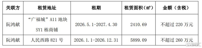关联交易概述 - 公司及子公司拟向关联方阮鸿献租赁房产 以满足日常经营需要[1] - 该关联交易被认定为正常的商业交易行为 基于公平公正互利原则进行[1] 交易具体条款 - 租赁地点一为"广福城"A11地块SY1栋商铺 租期为2026年5月1日至2027年4月30日 租赁面积2410.69平方米 金额不超过220万元[2] - 租赁地点二为人民西路821号 租期为2026年1月1日至2026年12月31日 租赁面积5899.09平方米 金额不超过260万元[2]