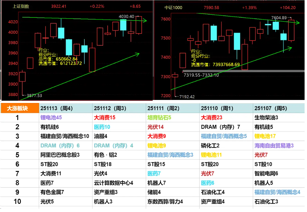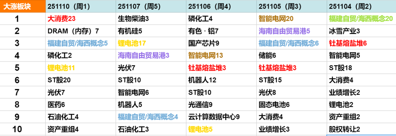 市场整体表现 - 市场呈现价升量增的普涨行情,两市成交额重回2万亿上方 [1] - 沪指上涨0.73%并再度刷新10年高点,深成指上涨1.78%,创业板指大幅上涨2.55% [1] - 个股表现强劲,近4000只股票上涨,近120只股票涨幅超过10%,微盘股指数反包续创历史新高 [1] 板块轮动表现 - 锂电池板块表现突出,在周四大涨板块中排名第一,出现45家涨停,周二和周五也分别有9家和17家涨停 [3] - 大消费板块持续活跃,周一有23家涨停,周四有11家涨停,周二有9家涨停 [3] - 光伏板块多次出现在每日大涨榜中,周二有14家涨停,周四和周五均有5家和7家涨停 [3] - 福建自贸/海西概念板块本周表现活跃,周四有10家涨停,周二和周五分别有3家和4家涨停 [3] - ST股板块每日均上榜,周四有20家涨停,周三有18家涨停,周一有20家涨停 [3]
