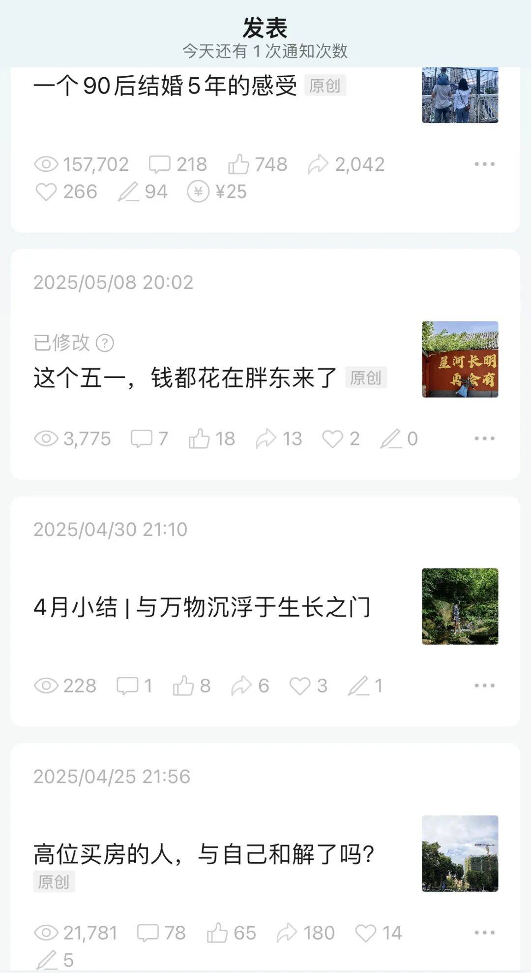 本文来自微信公众号:今心与禾火,作者:今心与禾火,本文首发于2025年6月3日,头图来自:AI生成 5月有几篇阅读量稍好的文章,做个非正式复盘: 《高位买房的人,与自己和解了吗?》:目前阅读量2w+,初始阅读量只有一百多,流量在5月初突然增加,自我分析,大概是踩中了一点时代情绪,像 我一样在高位买房的人不胜枚数,几年过去,同是天涯沦落人,大家都好奇,他人的人生有什么变化吗? 所以我写公众号这些年,单纯为爱发电。有收入是锦上添花,没有收入也不影响我忠实地记录生活。 回看这些阅读量,也更加确信,真诚是永远的必杀技。 虽然收入不过百,但我看到了另一些更珍贵的数据——那篇写婚姻的长文,完读率是21%。意味着每5个点开的人里,就有1个人读完全文。 单篇文章带来了1094位新朋友关注我的公众号;同时,公众号里其他"精选文章"的阅读量涨了600+,这大约说明,有600人因为推荐偶然点进这篇文章, 看完产生了一点兴趣,又主动去公众号主页翻看了过去的文字。 《这个五一,钱都花在胖东来了》:阅读量不算高,但已经高于我此前发过的文章,大概也是借了一点顶流的话题性。这篇其实是游记,甚至更多在写信 阳的山水和美食,此行我很喜欢河南,食 ...