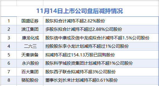 炒股就看金麒麟分析师研报,权威,专业,及时,全面,助您挖掘潜力主题机会! 据统计,11月14日,盘后国盛证券、滨江集团、康龙化成、二六三、天秦装备、永兴股份、百大集团、 骆驼股份等8家A股上市公司披露减持情况。当时暂无上市公司披露增持情况。 | | | 11月14日上市公司盘后减持情况 | | --- | --- | --- | | 1 | 国盛证券 | 股东拟合计减持不超2.82%股份 | | 2 | 混制度 | 多股东拟合计减持不超过2.88%公司股份 | | 3 | 康龙化成 | 股东信中康成及信中龙成拟合计减持不超1.5%公司股份 | | র্ব | 二六三 | 控股股东李小龙计划减持不超过1%公司股份 | | 5 | 天秦装备 | 拟减持不超过154.13万股已回购股份 | | 6 | 永兴股份 | 股东科学城投资集团计划减持不超1%公司股份 | | / | 百大集团 | 股东西子联合拟减持不超3%公司股份 | | 8 | 骆驼股份 | | 沪指再创反弹新高,3分钟便捷开户,把握投资先机!长江证券三大尊享福利>> ...