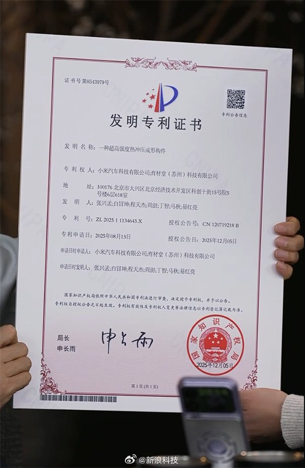 【#雷军晒专利证书回应自研超强钢##雷军晒超强钢专利证书#】今晚,雷军再次开启直播,据悉此次直 播将持续2小时,除了聊新一代SU7外,他还将直面回应一些质疑。#雷军新一代SU7直播约2小时# 雷军强调:"专利是技术的'身份证',2200MPa不是宣传噱头,是经过研发、测试、量产验证的真实能 力,欢迎行业内外随时取样检测。"(快科技) 直播刚开始没多久,雷军就回应超强钢是否自研的问题,并晒出了专利证书。 证书号第8543979号 专利会责任意 发明专利证书 发 明 名称:一种超高强度热冲压成形构件 专 利 权 人: 小米汽车科技有限公司;有材堂(苏州)科技有限公司 地 址:100176 北京市大兴区北京经济技术开发区科创十街15号院5 号楼6层618室 人:张兴孟:白冒坤:程天杰;网游:丁智:马秋:易红亮 发 明 专 利 号:ZL 2025 1 1134643.X 授权公告号: CN 120719218 B 专利申请日:2025年08月13日 授权公告日:2025年12月05日 申请日时申请人:小米汽车科技有限公司;育材堂(苏州)科技有限公司 申请日时发明人:张兴孟;白冒坤;程天杰;周时:丁智:马秋:易红亮 国 ...
