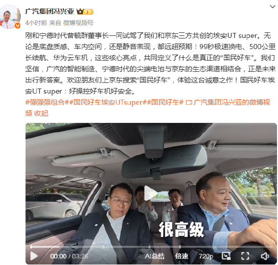 广汽冯兴亚与宁德时代曾毓群试驾埃安UT super,称其表现远超预期