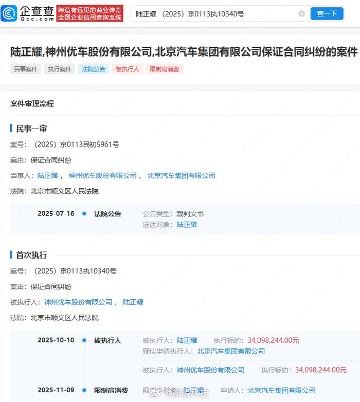 陆正耀因未履行给付义务被北汽集团申请限消
