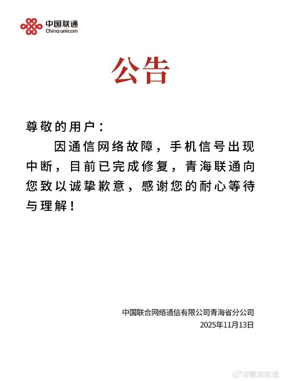 青海多地用户手机信号出现中断 青海联通致歉:已完成修复