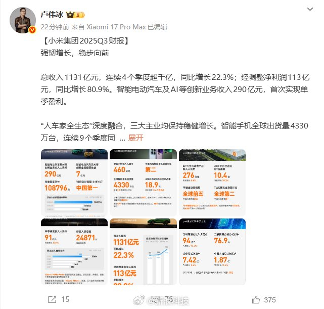 责任编辑:刘明亮 11月18日下午消息,小米集团(HKEX: 1810)今日发布了2025年第三季度财报:总收入达到1131亿 元,同比增长22.3%;净利润为123亿元,同比增长129.5%。非国际财务报告准则计量,经调整净利润 为113亿元,同比增长80.9%。 ...
