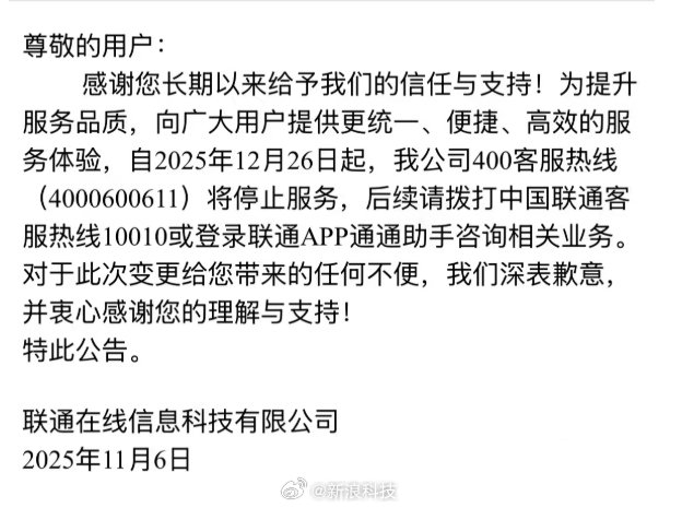 【#中国联通400客服热线将停止服务#】中国联通 11 月 6 日发布公告,为提升服务品质,向广大用户提 供更统一、便捷、高效的服务体验,自 2025 年 12 月 26 日起,中国联通 400 客服热线(4000600611) 将停止服务,后续请拨打中国联通客服热线 10010 或登录联通 App 通通助手咨询相关业务。 4000600611 是中国联通在线客服支撑服务中心客服热线,也是联通智家的客服热线,未来都将统一至 10010。 对于此次变更给您带来的不便,我们深表歉意!同时也衷 心感谢您的理解与支持。我们将继续努力,为您提供更优质的 服务体验。 特此公告 联通在线信息科技有限公司 2025年11月 6 @新浪科技 关于《联通智家400热线服务变 更》的通知 尊敬的联通智家用户: 感谢您长期以来对我们的信任与支持!为向您提供更统 一、便捷、高效的服务体验,我们即将对客服热线服务进行调 整。 自 2025年 12月 26日 起, 联 通 智 家 原 客 服 热 线 【400-060-0611】将停止服务,后续请拨打中国联通客服热 线【10010】或登录联通智家APP(我的-帮助与反馈)/关注 联通智家微 ...