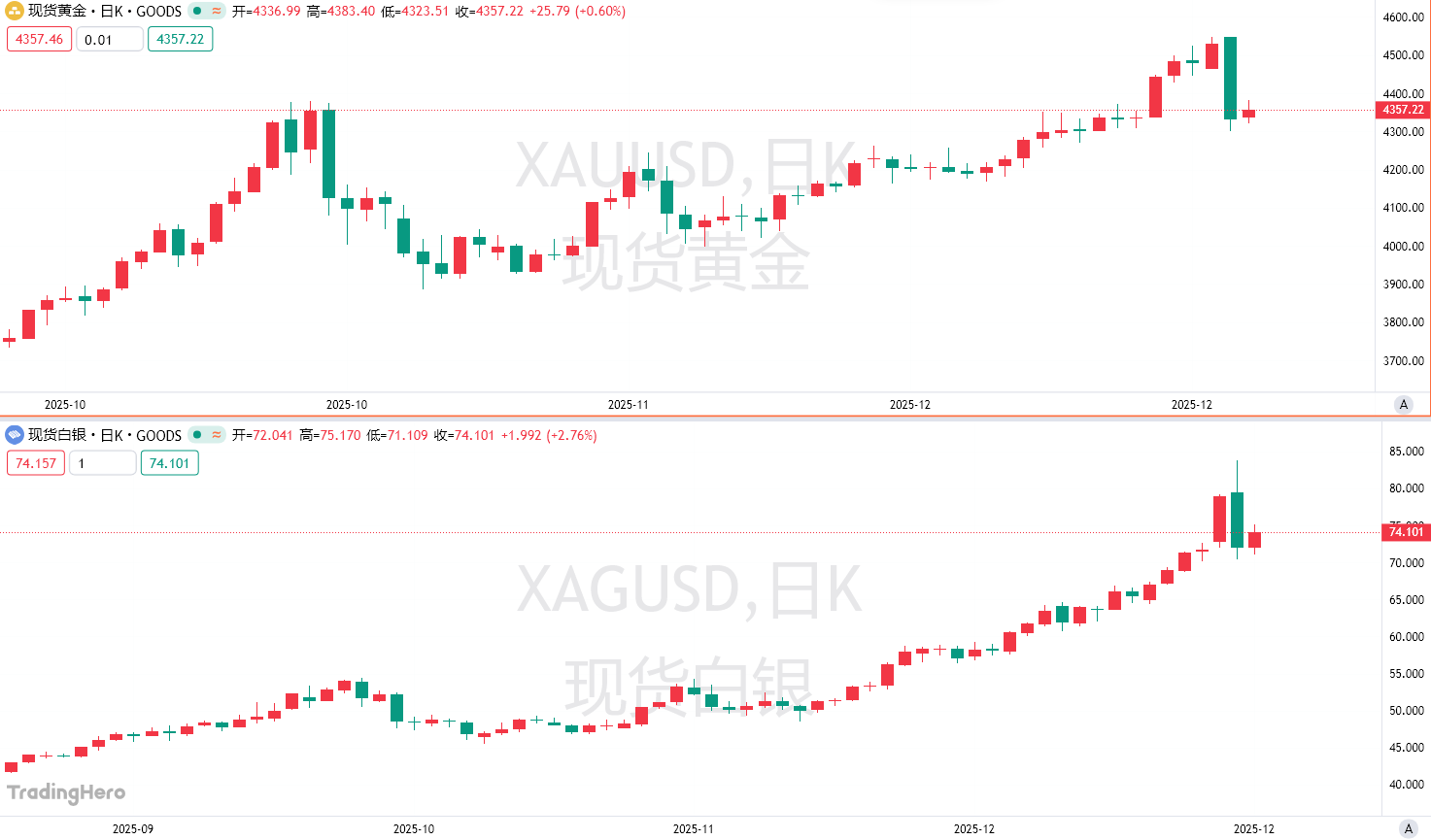 黄金和白银在触及历史新高后重挫,贵金属领域这波"抛物线式"的疯涨被猛踩了一脚急刹车。 周一,现货黄金大跌超4%,并一度跌至4310美元附近,白银一度暴跌10%,创下2021年以来最差单日表现,此前一度触及每盎司80美元。 交易员神经紧绷,因为芝加哥商品交易所(CME)提高了白银期货的保证金要求,迫使高杠杆交易员要么追加现金,要么抛售头寸。 贵金属今年表现亮眼,在央行强劲买入和美元走软的背景下,黄金今年迄今已飙升67%。 市场规模小得多的白银是今年的明星表现者,随着其工业用途让市场聚焦于供应短缺,白银上涨了近150%。就连铜和铂金今年也飙升至历史新高。 但一位贵金属多头一直警告金银涨势可能出现逆转,他指出,上一次它们涨得这么快还是在1979年,随后价格在1980年见顶并崩盘。 "当行情绷得这么紧时,要小心,"彭博行业研究的高级大宗商品策略师Mike McGlone本月早些时候指出。"对于像我这样永远看涨黄金的人来说,最重要的 事情只有四个字:获利了结。" "它对电子和计算至关重要,"白银协会总裁兼首席执行官Michael DiRienzo指出,"几乎所有带有开关的东西都要用到它。" DiRienzo指出,白银已 ...