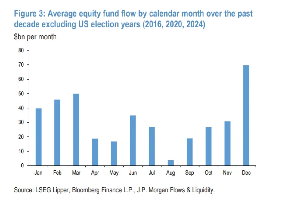 标普500指数(SPX)刚刚实现月线六连涨,为2021年8月以来最长连涨周期,9月和10月累计上涨近6%。受人工智能增长热潮推动,大型科 技股走强,该基准指数今年已创下36次历史新高。 "从季节性角度来看,过去两个月散户对股票的强劲买入势头,可能会持续到2026年初,"帕尼吉尔佐格鲁及其同事写道。 摩根大通策略师表示,散户投资者的强劲资金流入可能会支撑股市直至年底。 尼古拉奥斯·帕尼吉尔佐格鲁(Nikolaos Panigirtzoglou)领衔的团队在报告中称,这一预测基于对过去十年股票基金资金流入的季节性模式研 究。他们发现,在非美国大选年份,12月及次年一季度的平均资金流入往往更高。 过去10年按日历月计算的股票基金平均资金流入(不包括美国大选年) 他预计股市任何回调都不会持续太久。"归根结底,股市会是被逢低买入的标的,"普里沃罗茨基表示,并补充称,财政扩张、企业盈利和货 币供应量等因素,使得实物资产成为唯一值得持有财富的领域。 9月和10月,散户对股票的强劲需求体现在交易所交易基金(ETF)等投资工具的资金流入中。"特别是股票ETF,过去两个月每月流入1600 亿美元,是2024年11月/12月美国大 ...