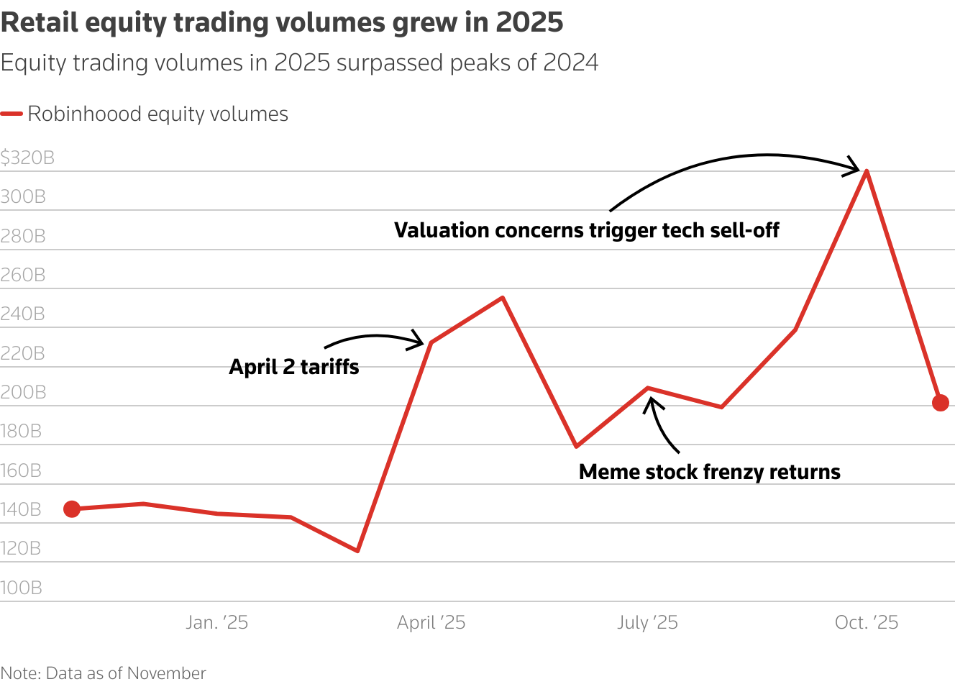 散户资金流入与市场影响 - 2025年散户投入美国股市的资金较去年同期的1970亿美元增长53%,较2021年散户交易狂热期峰值的2700亿美元高出14% [1] - 2025年散户交易量占总交易量的20%至25%,4月触及约35%的历史高点 [1] - 散户在股市抛售期间折价抢购优质股票,其抄底行为助推标普500指数在2025年累计上涨近17% [4] 散户交易行为特征 - 散户交易决策更具信息依据,表现为“迷因股狂热”次数减少、持续时间缩短 [7] - 散户对市场动态的敏感度在2025年有所提升 [8] - 散户愈发青睐交易所交易基金,因其可全天交易、税收效率高、透明度高 [6] 散户关注的资产类别 - 散户主导市场叙事,交易活跃的股票包括英伟达和特斯拉 [5] - 随着投资方式更趋“主题化”,量子计算公司、铀矿企业、金属矿企和稀土公司也获得散户大量关注 [5] - 德雷克斯半导体每日3倍做多ETF和德雷克斯半导体每日3倍做空ETF跻身eToro平台成交额前五的ETF [6] - 金融、通信、非必需消费、能源、矿业和黄金矿业类ETF可能表现良好 [11] - 散户热爱科技股,预计2026年仍会回流这一领域 [11] 市场趋势与未来展望 - 低成本、零佣金券商的兴起使普通美国人进入股市更便捷、成本更低,提升了散户参与度 [4] - 纳斯达克交易所计划推出全天候股票交易,可能进一步加速散户入市势头 [10] - 美联储的潜在降息有望在2026年持续提振市场,维持散户入市动能 [9] - 预计2026年散户资金流入不会超过2025年的纪录,因投资者可能会考虑多元化配置投资组合 [10]