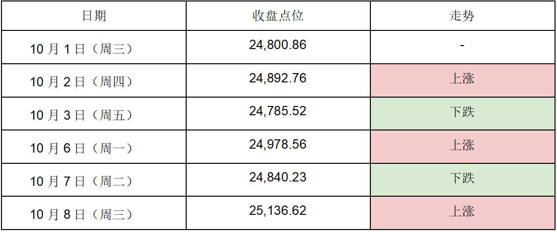 10月初纳斯达克100指数呈现出"震荡上行、间歇回调"的格局。 在过去的六个交易日中(10月1日至10月6日),指数上涨三天、下跌两天、一日持平,最终收于25,136.62 点,较周初上涨336点,涨幅约1.36%。 | 日期 | 收盘点位 | 走势 | | --- | --- | --- | | 10 月 1 日 (周三) | 24,800.86 | | | 10月2日(周四) | 24,892.76 | 上涨 | | 10月3日(周五) | 24,785.52 | 下跌 | | 10 月 6 日 (周一 ) | 24,978.56 | 上涨 | | 10 月 7日 (周二) | 24,840.23 | 下跌 | | 10 月 8日(周三) | 25,136.62 | 上涨 | 它向整个市场传递了一个清晰的信号:在构建超大规模AI模型方面,市场上已出现一个可靠的、可规 模化的第二选择,这将不可避免地在价格、性能和供应方面引入更激烈的竞争。 近期人工智能资金交易的网络是否在推动AI的泡沫? 指数表现强劲,一度突破25,000点的心理关口,10月6日收于25,136.62点,再次确立了其作为科技股风 向标的地位 ...