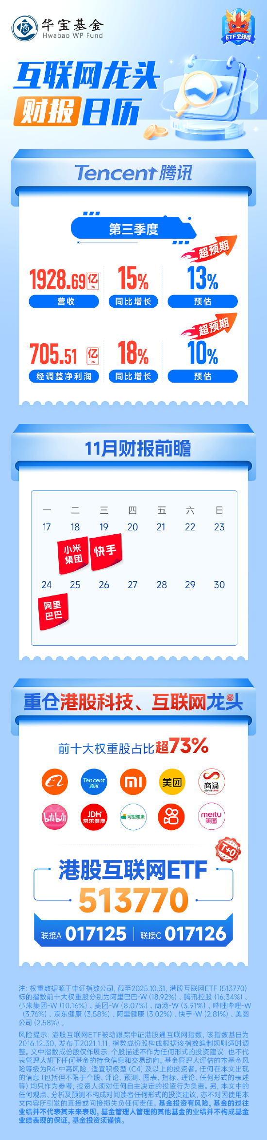 小米集团-W (10.16%)、美团-W (8.07%)、商汤-W (3.91%)、哔哩哔哩-W (3.76%)、京东健康(3.58%)、阿里健康(3.02%)、快手-W (2.81%)、美图 公司 (2.58%)。 华宝基金 Hwabao WP Fund 互联网 72 字头 财报|号| 广 Tencent 腾讯 第三季度 超预期 15% 1928.69@ 13% 营收 同比增长 预估 an Music Program Program Program Comment Com 18% 705.51 96 经调整净利润 同比增长 预估 11月财报前瞻 | | 六 五 E ■ 20 17 18 19 21 22 23 小米 快手 集团 29 26 24 25 27 28 30 阿里 ବିବ 重仓港股科技、互联网龙 前十大权重股占比超73% Tencent 手元 版计 同年號 a Re 联接A 017125 | 联接c 01 74 22. 注: 权重数据源于中证指数公司,截至2025.10.31,港股互联网ETF (513770) 标的指数前十大权重股分别为阿里巴巴-W (18.92%)、腾讯控股 (16.34%)、 ...