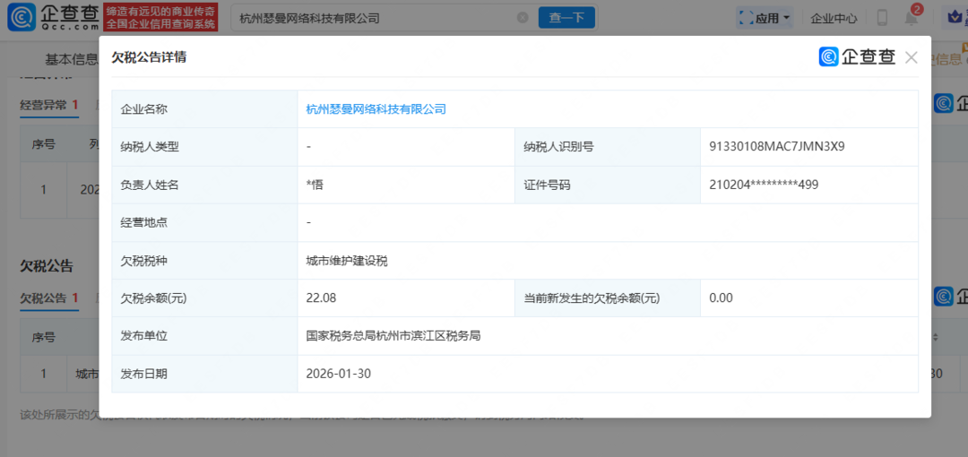 公司核心事件 - 杭州瑟曼网络科技有限公司新增一则欠税公告,欠税税种为城市维护建设税,欠税余额为22.08元 [1] - 该公司为网红“猫一杯”(本名徐嘉艺)关联的MCN机构,此前因炒作“在巴黎拾到小学生作业本”事件而受到关注 [1] - 根据股权穿透信息,网红“猫一杯”(徐嘉艺)间接持有该公司约41%的股份 [1]