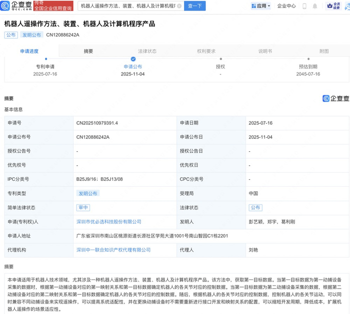 企查查APP显示,近日,深圳市优必选科技股份有限公司申请的"机器人遥操作方法、装置、机器人及 计算机程序产品"专利公布。企查查专利摘要显示,本申请适用于机器人技术领域。该方法中,获取第 一目标数据。当第一目标数据为第一动捕设备采集的数据时,根据第一动捕设备对应的第一映射关系和 第一目标数据确定机器人的各关节对应的控制数据。当第一目标数据为第二动捕设备采集的数据,根据 第二动捕设备对应的第二映射关系和第一目标数据确定机器人的各关节对应的控制数据。随后,根据机 器人的各关节对应的控制数据,控制机器人的各关节运动,可以同时兼容不同动捕设备来实现遥操作, 可以提高系统适配性,并在更换动捕设备时不需要重新进行接口开发和映射关系的配置,可以缩短开发 周期,降低成本,扩展机器人遥操作的场景适应性。 | 基本信息 | | | | | --- | --- | --- | --- | | 申请号 | CN202510979391.4 | 申请日期 | 2025-07-16 | | 申请公布号 | CN120886242A | 申请公布日 | 2025-11-04 | | 授权公告号 | | 授权公告日 | | | 优先权号 | ...