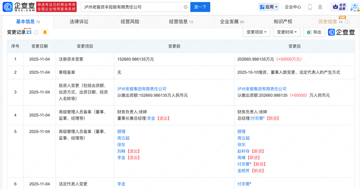 | 基本信息 70 | 法律诉讼 | 经营风险 | 经营信息 13 企业发展 90 | 知识产权 | 历史信息 1 1 | | --- | --- | --- | --- | --- | --- | | 法定代表人 | 付震要 精关联企业 9 | 登记状态 | 存续(在宫、开业、在册) | 成立日期 | 2022-12-20 | | | | 注册资本 | 202660.986135万元 益 | 实燈资本 | 57000万元 1 | | 组织机构代码 | MAC5F4GB-8 | 工商注册号 | 510500010015031 | 纳脱人识别号 | 91510500MAC5F4GB8D | | 企业类型 | 有限责任公司(非自然人投资或控股 的法人独测) | 营业期限 | 2022-12-20 至 无因定期限 | 纳税人资质 | 一般纳税人 | | 人员规模 | | 参保人数 | 0 (2024年报) 0 | 核准日期 | 2025-11-04 | | | | 分支机构参保人数 | 0 (2024年报) | | | | 所属地区 | 四川省泸州市龙马潭区 | 登记机关 | 泸州市市场监督管理局 | | | | ...