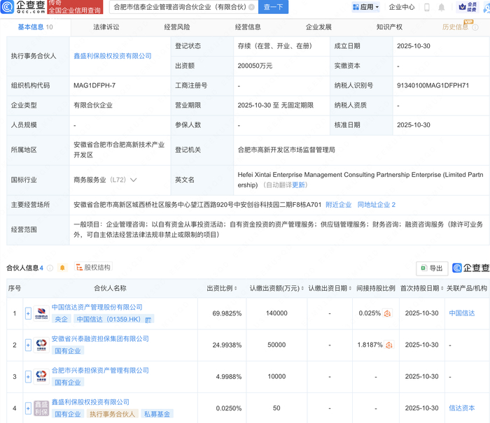 公司基本信息 - 合肥市信泰企业管理咨询合伙企业(有限合伙)于2025年10月30日成立 登记状态为存续 营业期限为无固定期限 [2] - 公司出资额为200050万元(约20亿元人民币) [1][2] - 公司类型为有限合伙企业 注册于安徽省合肥市高新技术产业开发区 [2] - 公司经营范围包括企业管理咨询 以自有资金从事投资活动 自有资金投资的资产管理服务 供应链管理服务 财务咨询 融资咨询服务 [1][2] 股权结构与出资方 - 公司由中国信达资产管理股份有限公司控股 出资比例为69.9825% 认缴出资额为140000万元 [2] - 安徽省兴泰融资担保集团有限公司为第二大股东 出资比例为24.9938% 认缴出资额为50000万元 [2] - 合肥市兴泰担保资产管理有限公司出资比例为4.9988% 认缴出资额为10000万元 [2] - 执行事务合伙人为鑫盛利保股权投资有限公司 出资比例为0.0250% 认缴出资额为50万元 [2]