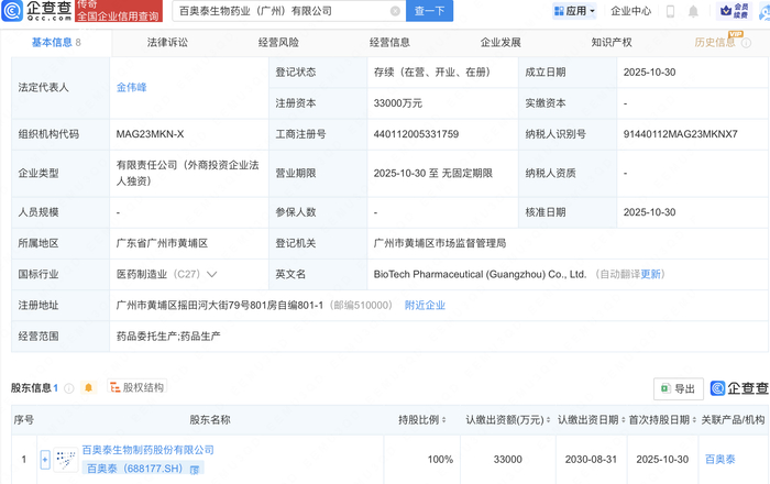 公司新设与股权结构 - 百奥泰生物药业(广州)有限公司于2025年10月30日成立,登记状态为存续 [2] - 新公司由上市公司百奥泰(688177)全资持股,持股比例为100% [1][2] - 新公司注册资本为3.3亿元人民币(33000万元) [1][2] 公司基本信息与经营范围 - 公司企业类型为有限责任公司(外商投资企业法人独资) [2] - 公司所属行业为医药制造业(C27) [2] - 公司核心经营范围包括药品委托生产和药品生产 [1][2] 公司注册与管理信息 - 公司注册地址位于广东省广州市黄埔区摇田河大街79号801房 [2] - 公司登记机关为广州市黄埔区市场监督管理局 [2] - 公司营业期限为无固定期限 [2]