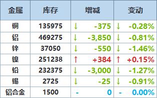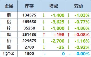 》查看更多金属库存信息 | 金屋 | 阵存 | | 增减 变动 | | --- | --- | --- | --- | | 铜 | 134575 | - | -1.400 J -1.03% | | 铝 | 465650 | ﺑﺴ | -3.625 1 -0.77% | | 锌 | 35250 | - | -1.800 -4.86% | | 寝 | 251436 | 1 | +198 ↑ +0.08% | | 铝 | 229675 | - | -2,700 J -1.16% | | 锡 | 2700 | + | -25 -0.92% | | 铝合金 | 1500 | | 0 - 0.00% | | LME库存 | | --- | | 金屋 | 阵 | 注册仓单 | 变动 | 注销仓单 | 变动 | | 汗镜吊炸 下日异战 | | --- | --- | --- | --- | --- | --- | --- | --- | | 铜 | 134575 | 123400 | 1 -2.06% | 11175 | 1 +12.03% | 8.30% | 7.34% | | 분 | 465650 | 404675 | ...
