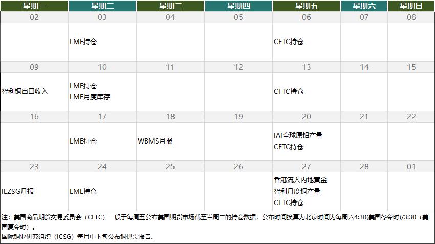 金属市场2月重要数据发布日程 - 2月3日、10日、17日、24日将发布伦敦金属交易所持仓报告 [1] - 2月5日、13日、20日、27日将发布美国商品期货交易委员会持仓报告 [1] - 2月10日将发布伦敦金属交易所月度库存数据 [1] - 2月11日将发布世界金属统计局月度报告 [1] - 2月20日将发布国际铝业协会全球原铝产量数据 [1] - 2月23日将发布国际铅锌研究小组月度报告 [1] - 2月27日将发布香港流入内地黄金数据及智利月度铜产量数据 [1] - 2月9日将发布智利铜出口收入数据 [1] 关键数据发布时间说明 - 美国商品期货交易委员会持仓数据一般于北京时间每周六4:30(美国冬令时)或3:30(美国夏令时)公布,数据统计截至当周周二 [1]