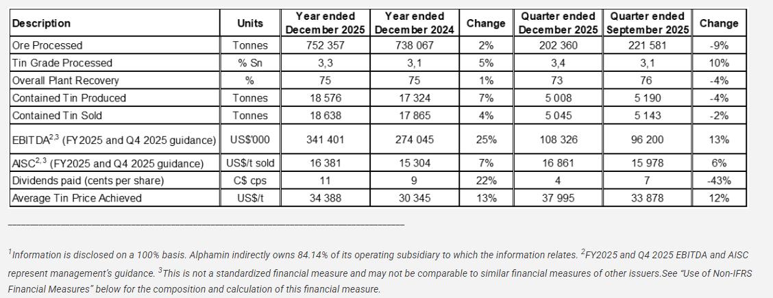 2025财年及第四季度运营与财务表现 - 2025财年全年锡产量为18,576吨,同比增长7%,基本符合调整后18,000-18,500吨的产量指引 [1] - 2025财年全年加工矿石量为752,357吨,同比增长2% [2] - 2025财年全年加工锡品位为3.3%,较上一财年的3.1%提升5% [2] - 2025财年全年整体工厂回收率稳定在75% [1][2] - 2025财年第四季度锡产量为5,008吨,环比下降4%,与5,000吨的季度目标一致 [1] - 2025财年第四季度加工矿石量为202,360吨,环比下降9% [2] - 2025财年第四季度加工锡品位为3.4%,环比提升10% [2] - 2025财年第四季度整体工厂回收率为73%,环比下降4个百分点 [2] 2025财年及第四季度销售与盈利 - 2025财年全年锡销量为18,638吨,同比增长4% [2] - 2025财年全年实现的平均锡价为每吨34,388美元,同比增长13% [2] - 2025财年全年EBITDA为3.414亿美元,同比增长25% [2] - 2025财年全年全部维持成本为每吨16,381美元,同比增长7% [2] - 2025财年第四季度锡销量为5,045吨,环比下降2% [2] - 2025财年第四季度实现的平均锡价为每吨37,995美元,环比增长12% [2] - 2025财年第四季度EBITDA为1.083亿美元,环比增长13% [2] - 2025财年第四季度全部维持成本为每吨16,861美元,环比增长6% [2] 股东回报与产量指引 - 2025财年全年每股派息为11加分,同比增长22% [2] - 2025财年第四季度每股派息为4加分,环比下降43% [2] - 公司发布2026财年产量指引,预计截至2026年12月的全年锡产量将达到20,000吨 [1] 运营中断事件 - 2025财年锡产量受到2025年3月因安全问题暂时停止运营以及2025年4月15日分阶段重启的负面影响 [1]