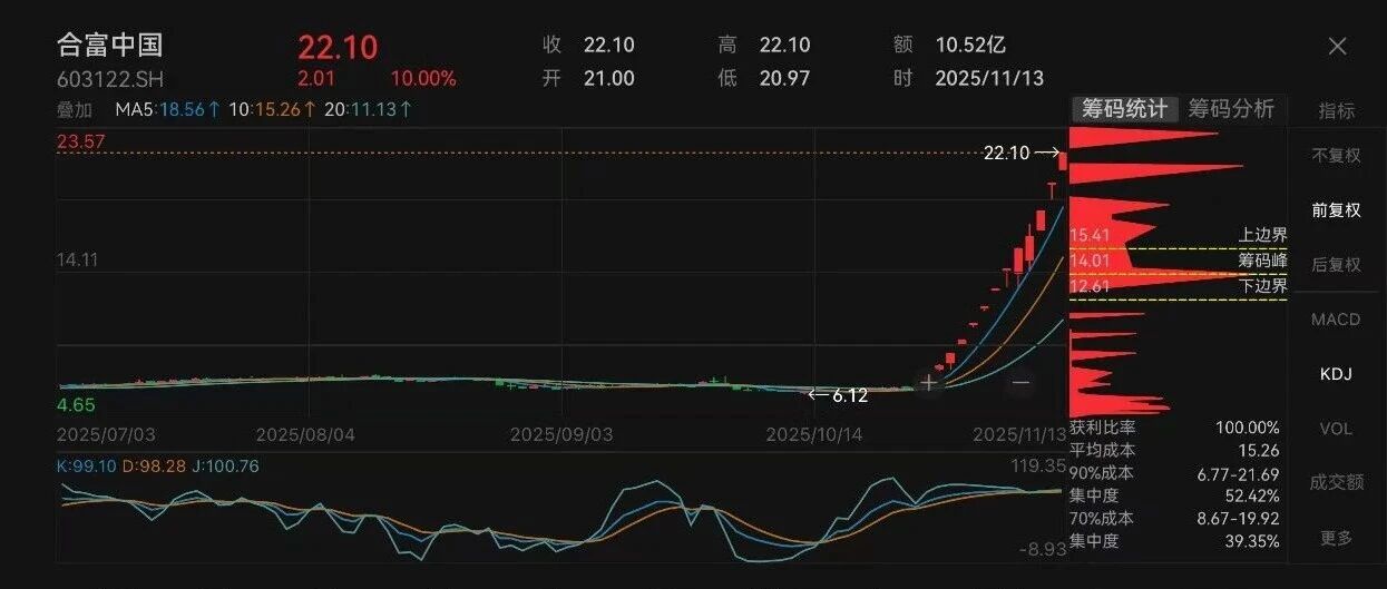 公告称,自2025年10月28日至2025年11月13日,公司股票连续十三个交易日中有十二个交易日以涨停价收盘,并5次触及股价异常波动、3次触及严 重异常波动情形,期间累计涨幅达230.84%。截至11月13日收盘,公司股价为22.10元/股,处于历史高位。股价短期内连续上涨,存在市场情绪过 热、非理性炒作风险,已明显高于同期行业及上证指数涨幅,且严重显著偏离公司基本面,随时存在快速下跌风险。 11月13日,合富中国晚间公告称,公司股价累计涨幅已严重偏离基本面,投资者参与交易可能面临较大风险。如公司股价进一步异常上涨,公司可能申 请停牌核查。 编辑丨钉钉 ...