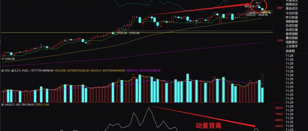 在上证指数4000点的一片尖叫声之中,我们再次来解读现在的状态: 前一次分析市场框架时讲过,上证指数在60分钟级别突破中枢B之后,选择背离是很正常的,因为趋势已经完美。那么后续最有可能的一种演变就是缠论 中所谓的小转大,也即60分钟的中枢B升级到日线级别的中枢B,如下图: 假设当下的顶分型成立,那么现在对应的动量明显处在顶背离状态,而且是日线级别的顶背离,这个信号理论上是需要严肃看待的。当然,不排除价格走 势迅速回到上升通道,那么这个背离可能会消除,所以我们无法仅凭这个图就判定这里一定见顶。 需要回到底层进一步分析。这一波上来,是算力这条线力挺的结果,这一点应该没有异议吧,那么接下来的问题是:算力硬科技+电力硬科技还能继续发 力么,如果这股劲松了,还有其它板块能接力上来么? OK,今天我们看到创新药动了,锂电则冲高回落,继续拭目以待。 光连接龙头新易盛的调整结构向右扩展,顶分型之后显露日线级别动量顶背离,这是大级别乏力的表现: 中际旭创也一样。这些显现至少说明我们已经不能积极地去看待光连接这个细分类别。 PCB板块要好看一些,但急急如生益电子和鼎泰科技这种连续超量赶顶,估计动量也释放得差不多了。 大家可以看到 ...