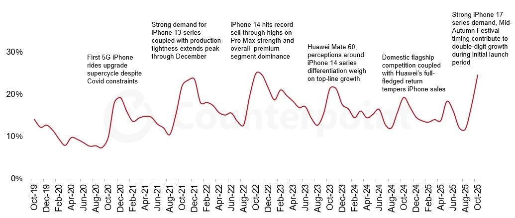 以下文章来源于Counterpoint 咨询 ,作者Counterpoint Counterpoint 咨询 . Counterpoint Research 是一家专注于科技行业的全球性研究公司,在全球主要的市场有着强大的影响 力。我们致力于为合作伙伴提供准确、及时的市场数据,帮助他们做出明智的决策。 在苹果以及中国主要 OEM 厂商的推动下,10 月中国智能手机销量同比增长 8%。 根据 Counterpoint Research 的中国 Market Pulse 智能手机月度销售追踪报告 的初步数据显示,10 月份智能手机销量在苹果 37% 的同比增长的推动下增长了 8%。"iPhone 17 系列继续为苹果带来佳 绩,其中基础款和 Pro 机型的增长最快," 高级分析师 Ivan Lam 表示,"新款 iPhone 的销量占比极 高,超过 80%,因此随着平均售价的上涨,我们预计整体销量将进一步提升。" 数据来源:Counterpoint Research Market Pulse 智能手机月度销售追踪报告 这是苹果 有史以来 在 Q4 的最佳开局表现,其总销量已经远远超过了 2021 年 10 月创下 ...