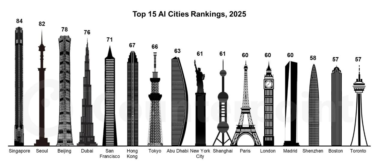 以下文章来源于Counterpoint 咨询 ,作者Counterpoint Counterpoint 咨询 . 新加坡在Counterpoint Research发布的《2025年全球AI城市指数》中高居榜首,首尔、北京、 迪拜和旧金山分列第二至第五位。 报告指出,微软和谷歌是推动AI城市活动的主力厂商,他们聚焦于数据中心开发、AI培训项 目以及持续的全球扩张。而华为凭借5G-A技术在推动电信领域的AI计划方面表现突出。 地缘政治因素已经渗透到了区域发展当中,目前北美仍然处于领先地位,而中国正迅速追赶。 而较为复杂的监管环境则制约了欧洲的AI发展。 在关键垂直领域,英伟达的超级计算机工厂使达拉斯超级计算能力方面跃居全球首位,领先于 北京。 与之相反的是,深圳凭借政府强有力的政策驱动的行业创新在机器人技术领域排名第一,甚至 超过了波士顿 班加罗尔、利雅得、杭州和圣保罗是全球发展最快的AI城市。 2025年全球AI城市排名Top15 来源:Counterpoint Research《2025年全球AI城市指数》 *评分衡量了每个城市AI的发展情况;满分100分。 地区亮点 新加坡之所以脱颖而出,是因为该市通过新 ...