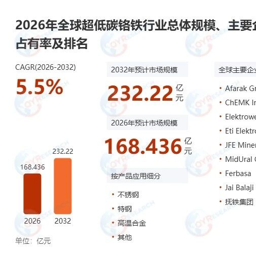 超低碳铬铁产品定义与市场概况 - 超低碳铬铁是一种碳含量极低的铬铁合金,属于要求最高、冶炼难度最大的精炼铬铁之一 [2] - 预计2032年全球超低碳铬铁市场规模将达到34.15亿美元,未来几年年复合增长率CAGR为5.5% [3] - 预计到2032年,全球市场规模将达到232.22亿元,2026年预计市场规模为168.436亿元,期间CAGR为5.5% [15][16] 全球主要生产商 - 全球主要生产商包括芬兰的Afarak Group、俄罗斯的ChEMK Industrial Group和MidUral Group、德国的Elektrowerk Weisweiler、土耳其的Eti Elektrometalurji、日本的JFE Mineral & Alloy、巴西的Ferbasa、印度的Jai Balaji Group以及多家中国公司,如抚铁集团、内蒙古亿力冶金等 [6][7][18] - 这些公司业务模式多为垂直一体化,涵盖从铬矿开采到铁合金生产的全链条,产品主要用于不锈钢和特种钢制造 [6][7] 产业链与供应链分析 - **上游**:主要为铬矿开采与供应,集中在南非、哈萨克斯坦、土耳其和印度等国,同时需要石灰、硅铁、电极、焦炭及大量电力等辅助材料 [8] - **中游**:为冶炼与精炼企业,通过铝热法、硅热法或AOD/VOD精炼工艺生产超低碳铬铁,产品通过金属贸易商和合金分销商进入全球市场 [8] - **下游**:主要为高端不锈钢、耐热合金和特种钢制造企业,应用于航空航天、核电设备、化工装备和高端机械制造等领域 [8] - 整体供应链具有资源集中度高、能源消耗大、与不锈钢产业联动性强的特点 [8] 市场驱动因素 - 核心驱动力来自下游高端不锈钢产业的持续升级,特别是全球(尤其是中国)对300系奥氏体不锈钢及双相不锈钢等高品质钢种的需求增长 [9] - 各国日益收紧的环保法规促使钢厂采用纯净度高的炉料以降低综合能耗与排放,巩固了超低碳产品的市场地位 [9] - 冶炼工艺进步(如大型封闭电炉与铁水预处理技术)使得规模化生产成本得到更好控制,增强了其经济性与供应稳定性 [9] - 新能源汽车、高端装备制造等新兴产业对高性能不锈钢的需求扩大,预计将长期驱动市场 [9] 市场阻碍因素 - 生产工艺复杂,对原料纯净度、设备及过程控制要求极高,导致生产成本显著高于传统产品,限制了其在成本敏感的中低端领域的应用 [10] - 市场需求完全依赖高端不锈钢(特别是300系不锈钢)的产量与景气度,易受宏观经济波动和建筑业等主要消费领域增长放缓的冲击 [10] - 生产技术壁垒高,碳含量的精确稳定控制需要深厚的技术积累,限制了众多中小型生产商的产能转向 [10] - 高品质铬矿资源的供应稳定性和价格波动会影响生产的连续性与成本可控性 [11] 行业发展机遇 - 下游高端不锈钢在新能源汽车、节能环保装备、氢能储运及特种化工等新兴战略产业的广泛应用,开辟了稳定增长的需求空间 [12] - 全球碳减排目标与环保法规持续推动钢铁产业链清洁化转型,从政策层面强化了对超低碳纯净原料的长期需求 [12] - 冶炼与精炼技术的持续进步(如更高效的真空精炼与智能化控制技术)正不断降低生产成本并提升稳定性,有助于拓宽市场应用基础 [12] - 全球供应链重塑背景下对关键材料自主可控的重视,为具备先进产能的企业带来了本土化发展的战略窗口 [12]